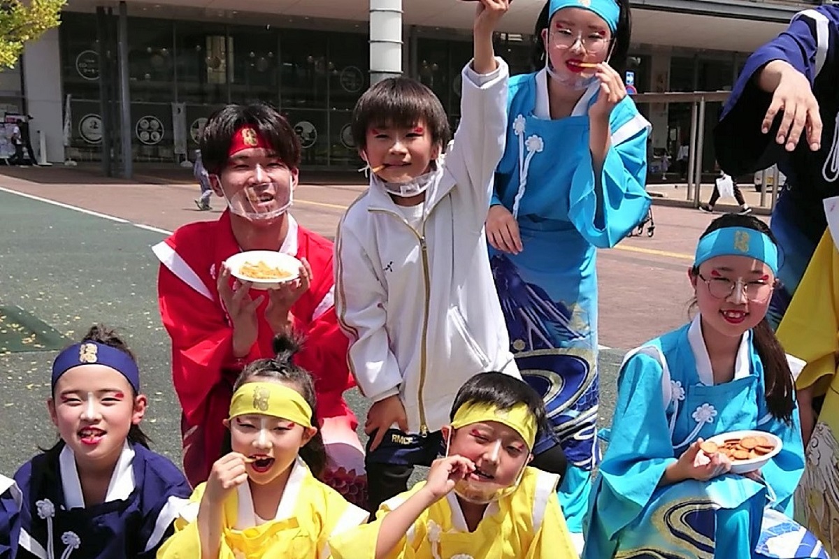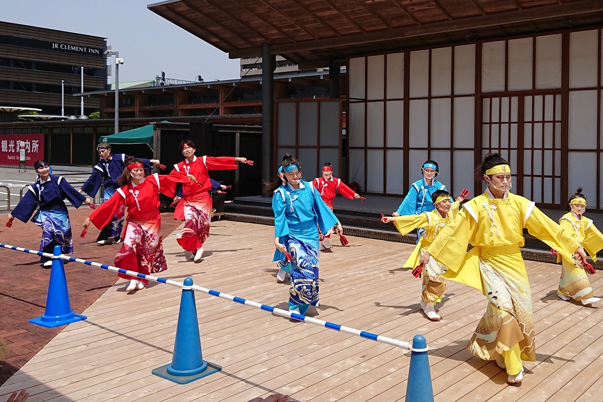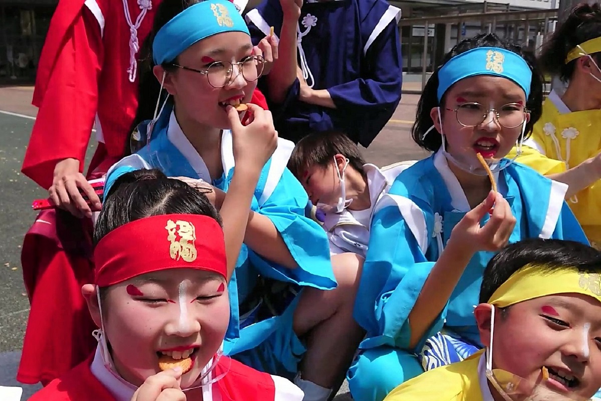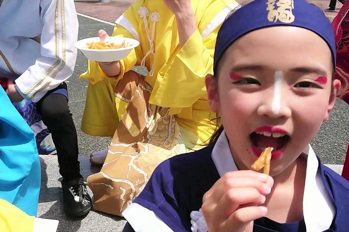 ミレーと芋けんぴでエネルギーを補給した「須賀IZANAI連」のみなさんは、この日2回目の演舞にのぞみ、見事なよさこい踊りを披露したのである。
