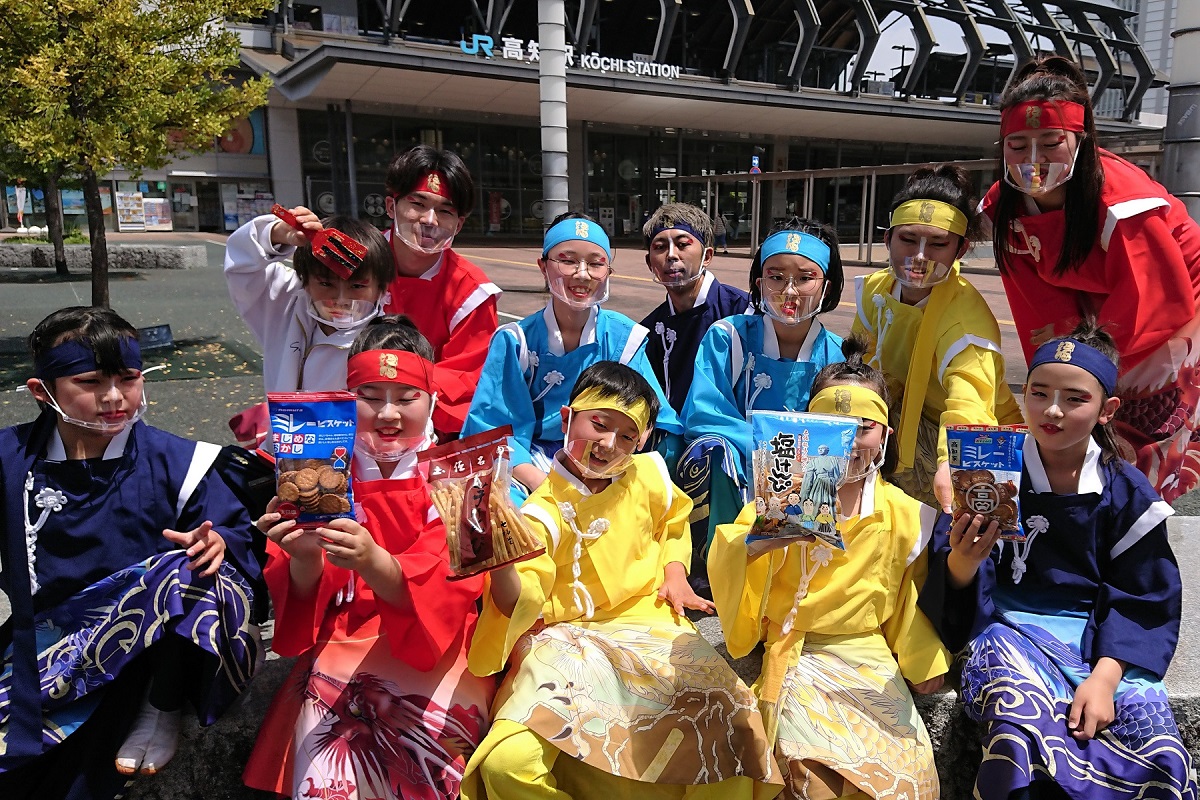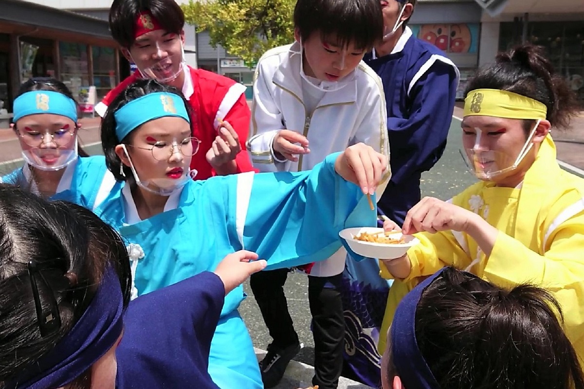 まずは、見事なよさこい踊りを披露していただいた、「須賀IZANAI連」のみなさんに食べていただく。