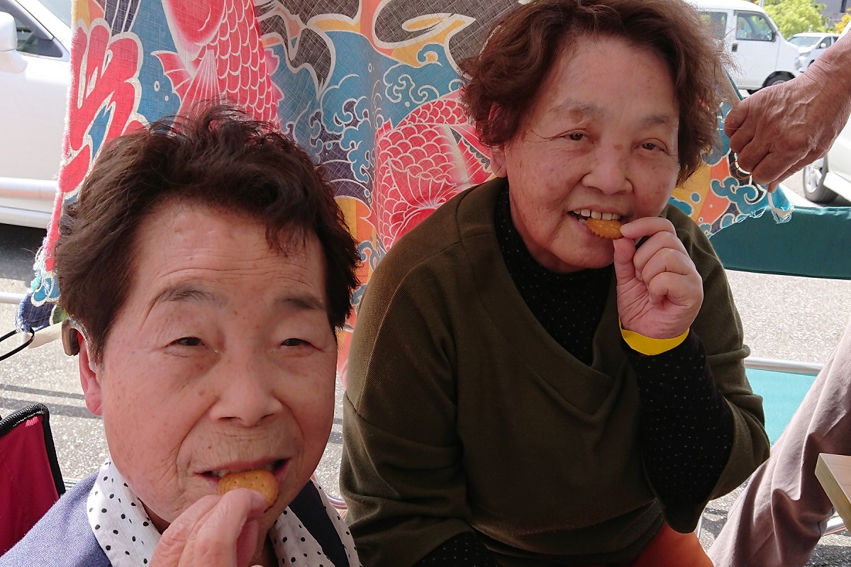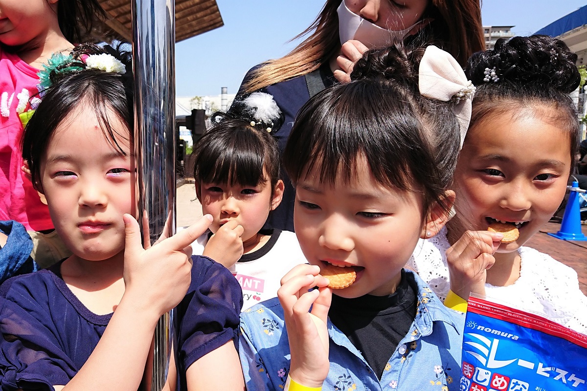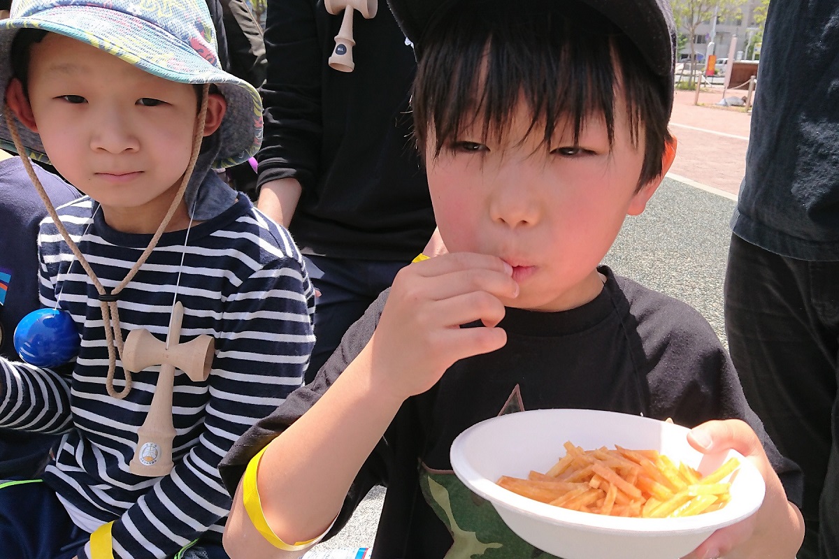 踊りの後で疲れているであろうに、大人も子供もつぎつぎに、ミレーをサクサクと、芋けんぴをカリカリと食べていく。