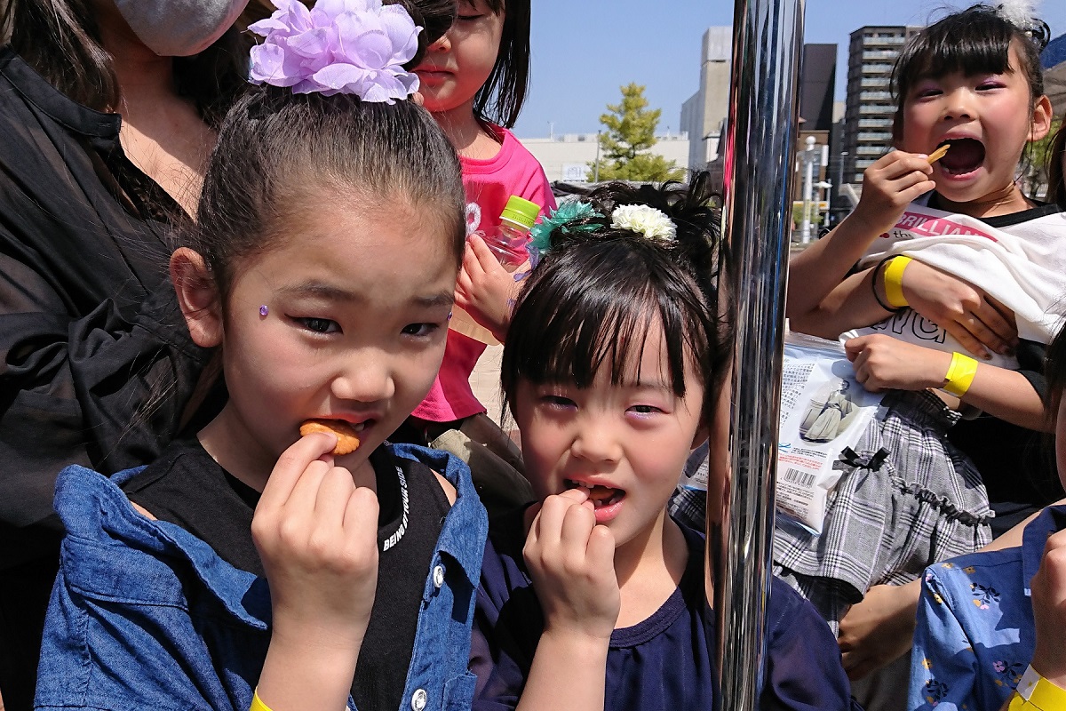 ステージを終えた彼女たちに、ミレーと芋けんぴを食べていただいた。