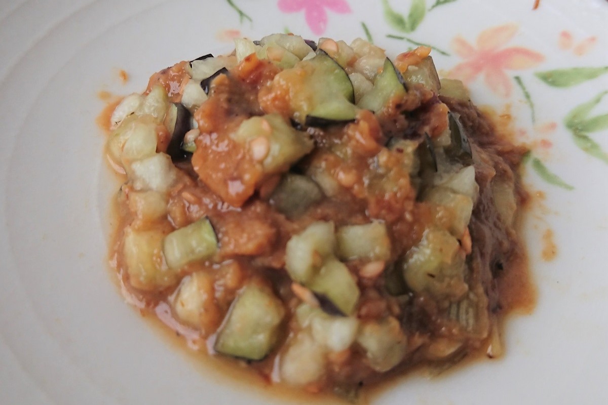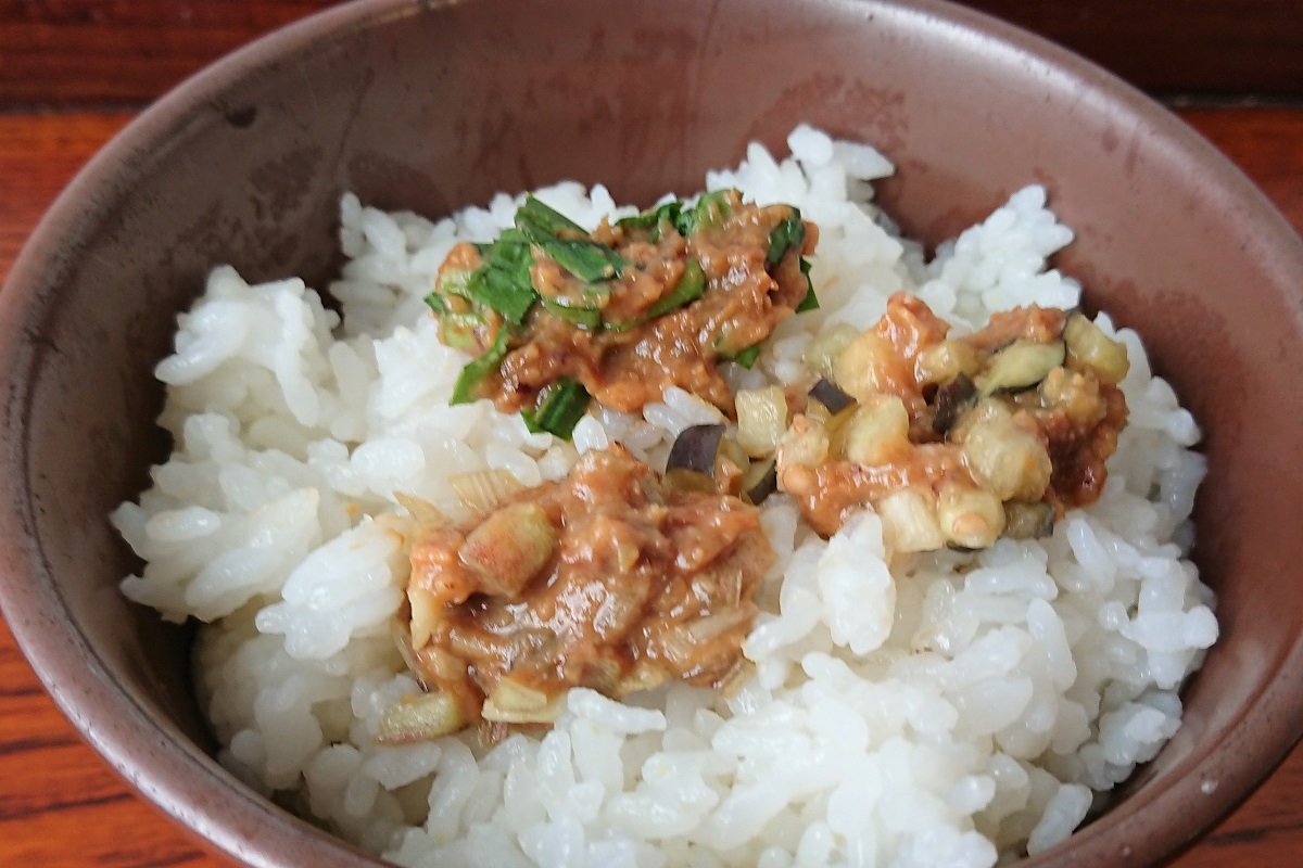 ナス特有の風味と柔らかな食感、そこに「ぶしみそ」の濃厚な味としっかりとした食感があわさると、ごはんが止まらなくなるのである。