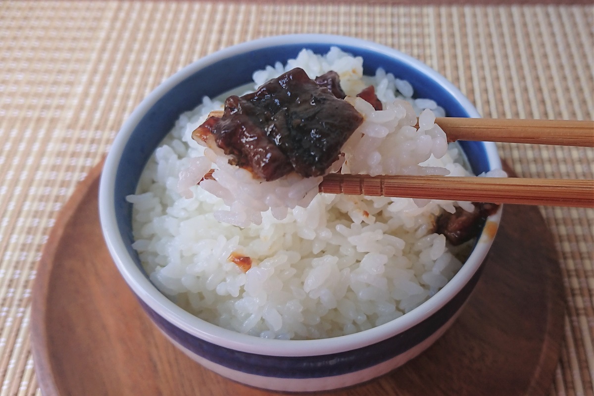 うなぎは非常に柔らかく煮つけられており、皮はトロトロである。箸でひとかたまりをつまみ、炊き立てのごはんの上にのせれば、もう我慢できない。ごはんと一緒に口いっぱいにほおばる。