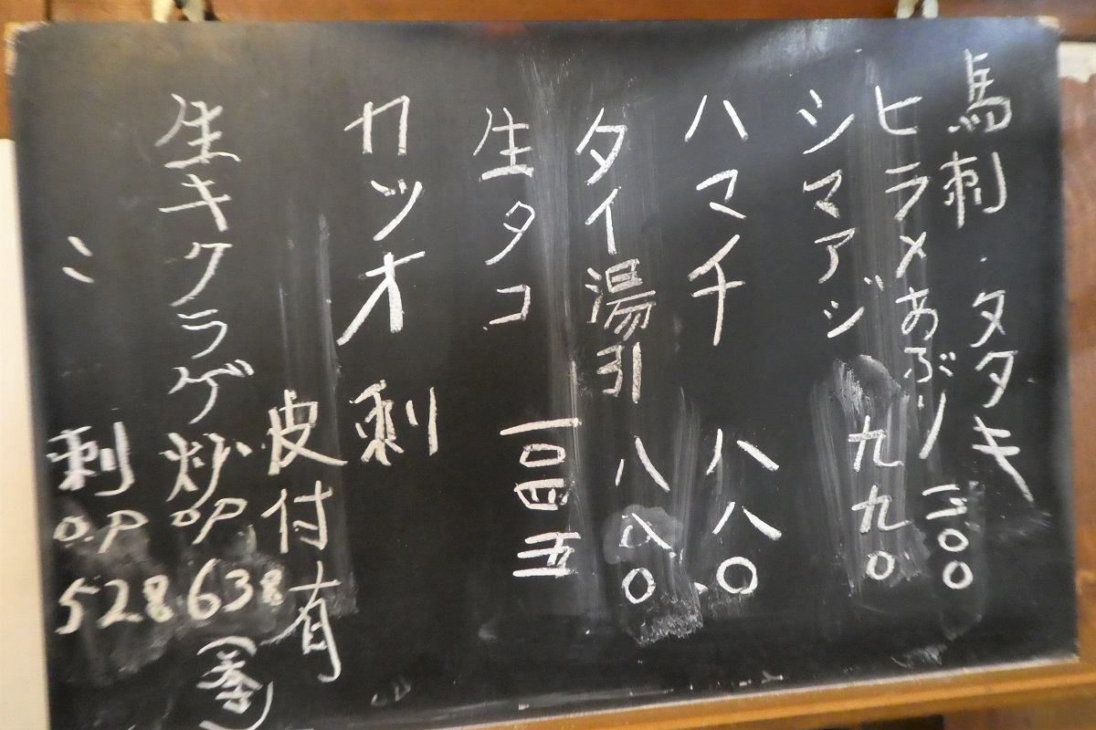 「葉牡丹」では高知名物カツオのタタキやカツオの刺身はもちろん、きびなごや沖ウルメ、メヒカリといった土佐の魚も味わうことができ、またその日揚がりのさまざまな魚も楽しめる。