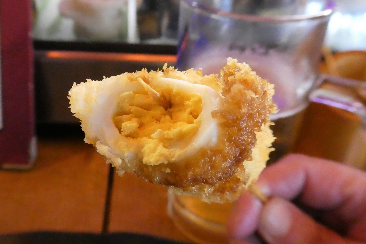 追加で串フライを注文する。「いも天(88円)」と「う玉(99円)」こと、うずらの玉子だ。