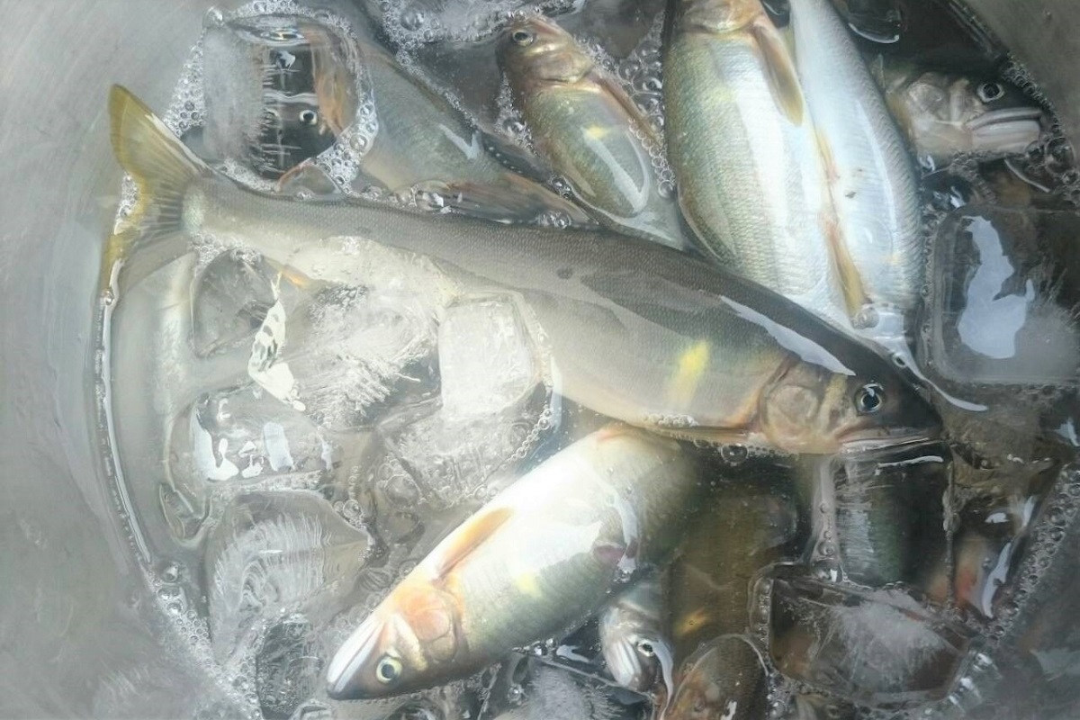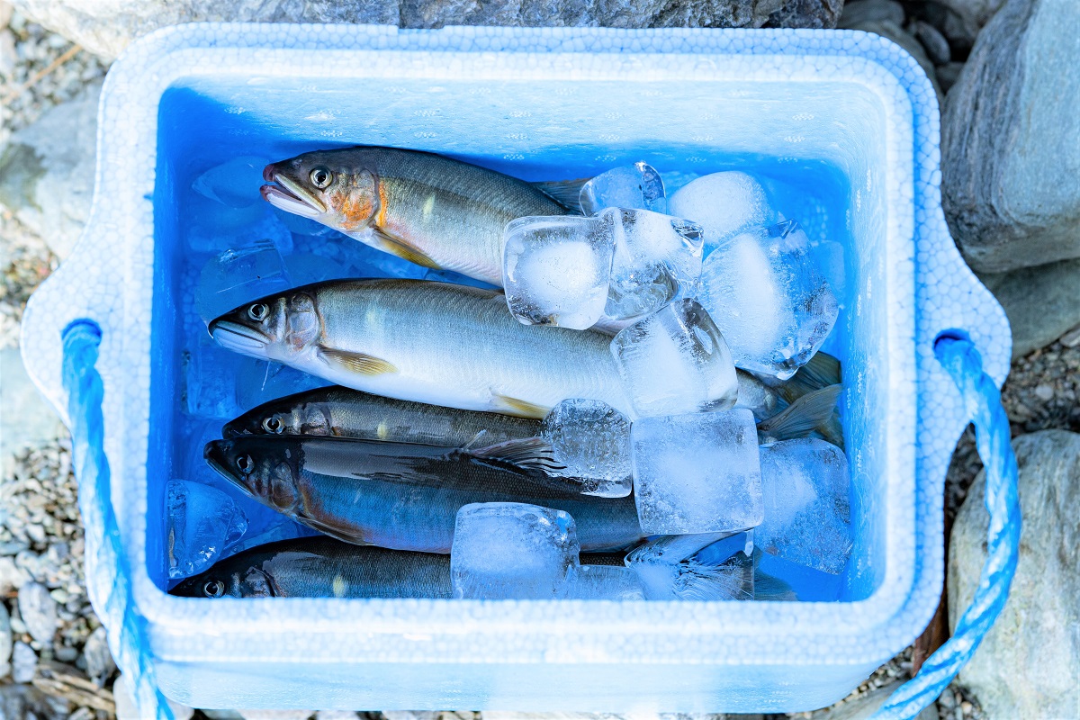 釣り上げられた鮎は、塩を加えた氷水で急速に冷やし締めたのち、真空パックに詰め冷凍する。