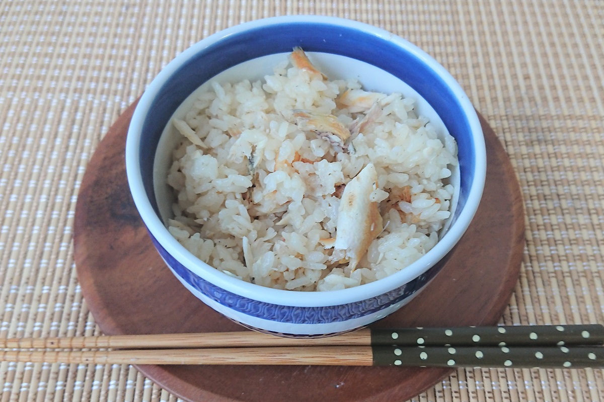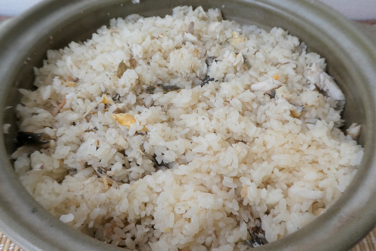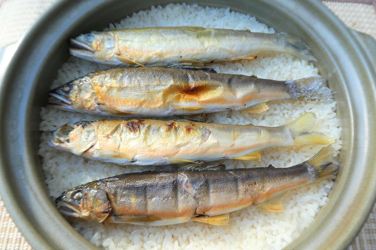 焼いた鮎を米の上にのせ、炊き上げるレシピも多くみられるが、「鮎屋仁淀川」のおすすめは、型が小さめの鮎からとった出汁に、塩と醬油、酒を加え味を整え、その出汁で米を炊き上げたのち、別に焼いた鮎をほぐし混ぜ込むという。