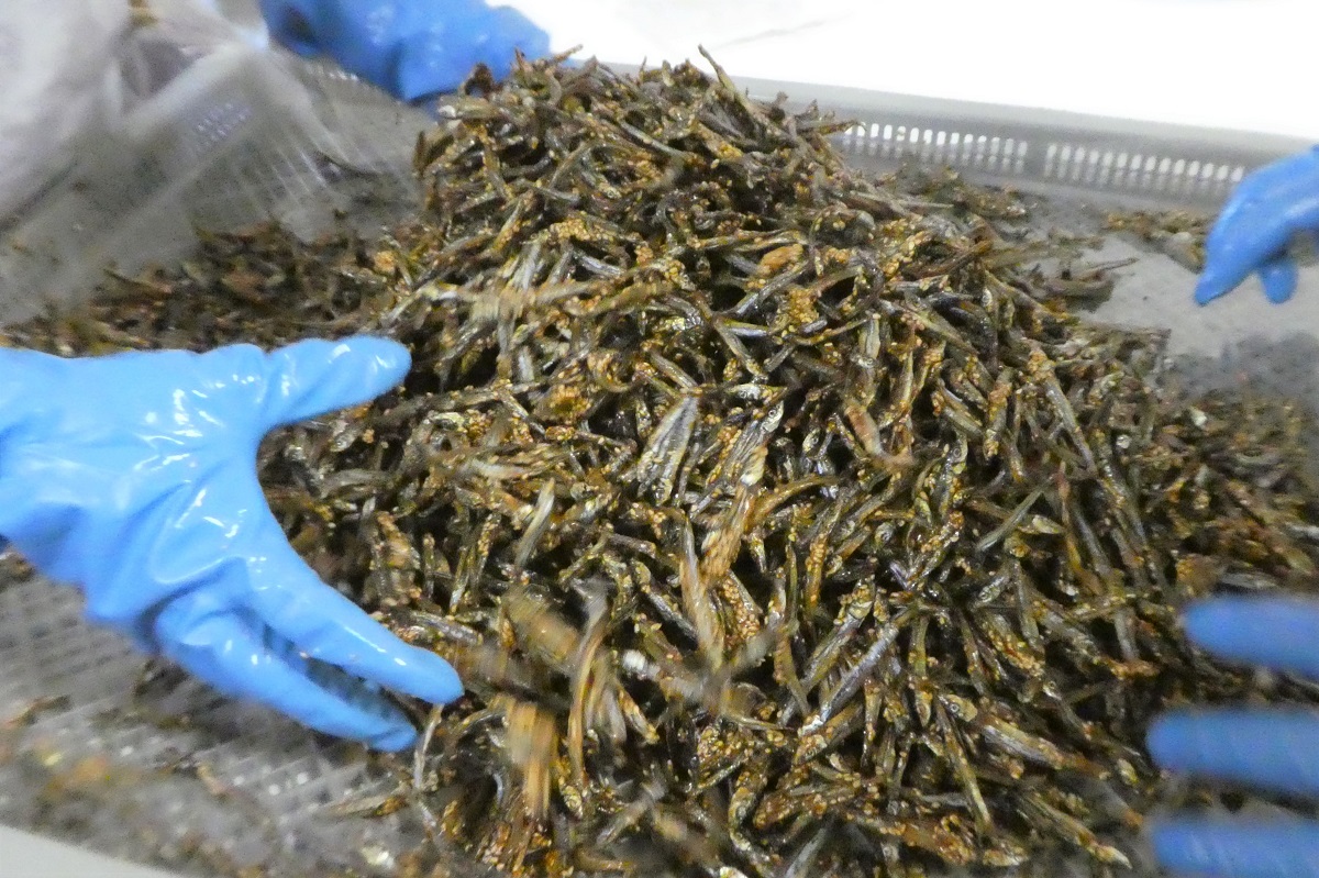 「きびなごケンピ」の作り方は、乾燥させたきびなごを選別するところから始まる。サイズごとに分別し、時間を調整して、全てを同じ堅さに仕上げたのち、袋ごとに魚のサイズが偏らないように再び混ぜ合わせる。