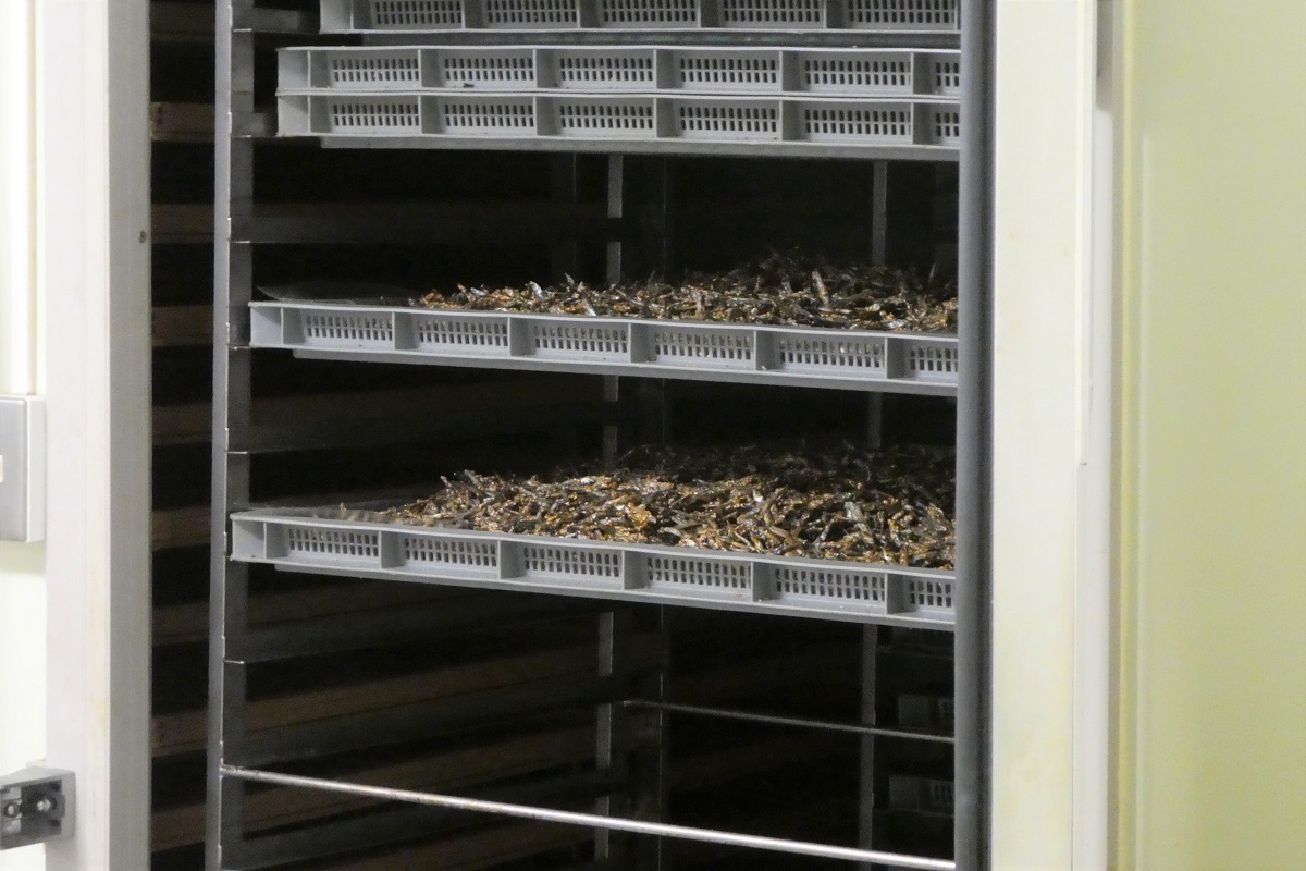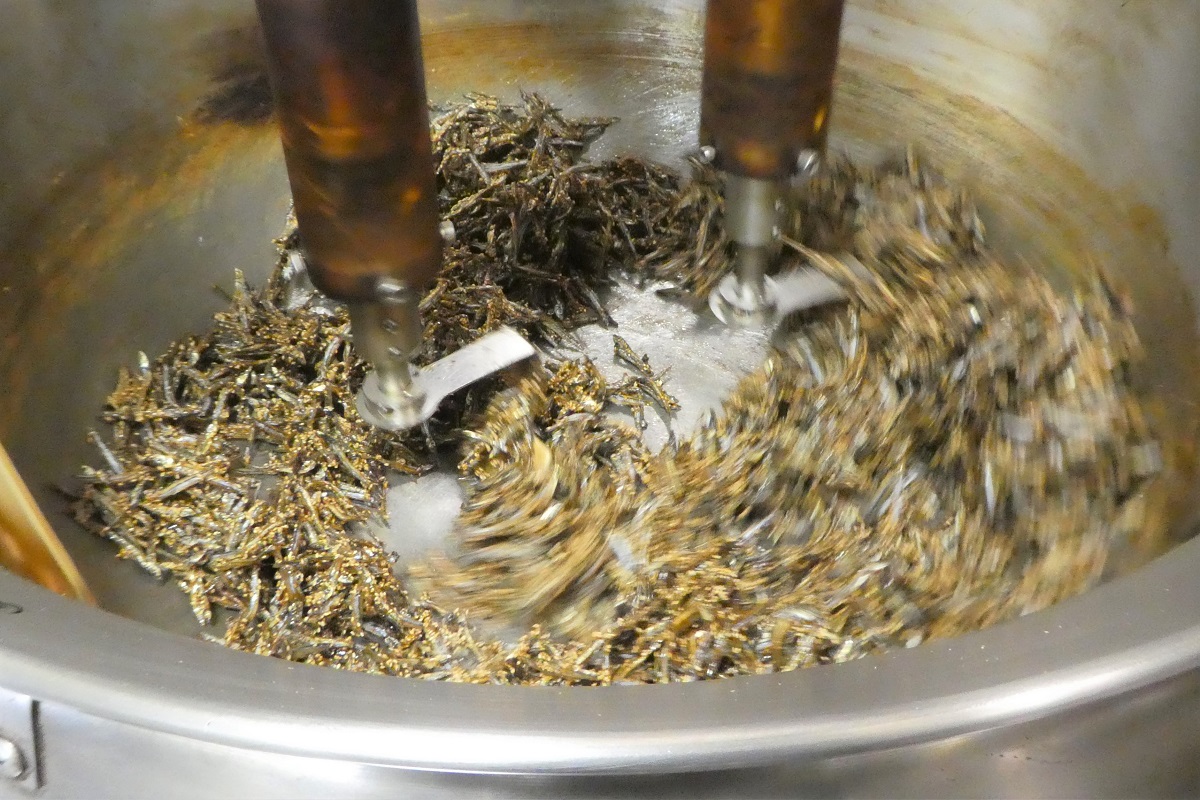 その後、攪拌機で高速で混ぜ合わせながら加熱・味付けを行い、全体に味が絡んだらパットに広げて冷まし、何度も人の手で混ぜながら粗熱をとり、最後に冷風乾燥機に入れて完全に熱をとってやると「きびなごケンピ」の完成である。