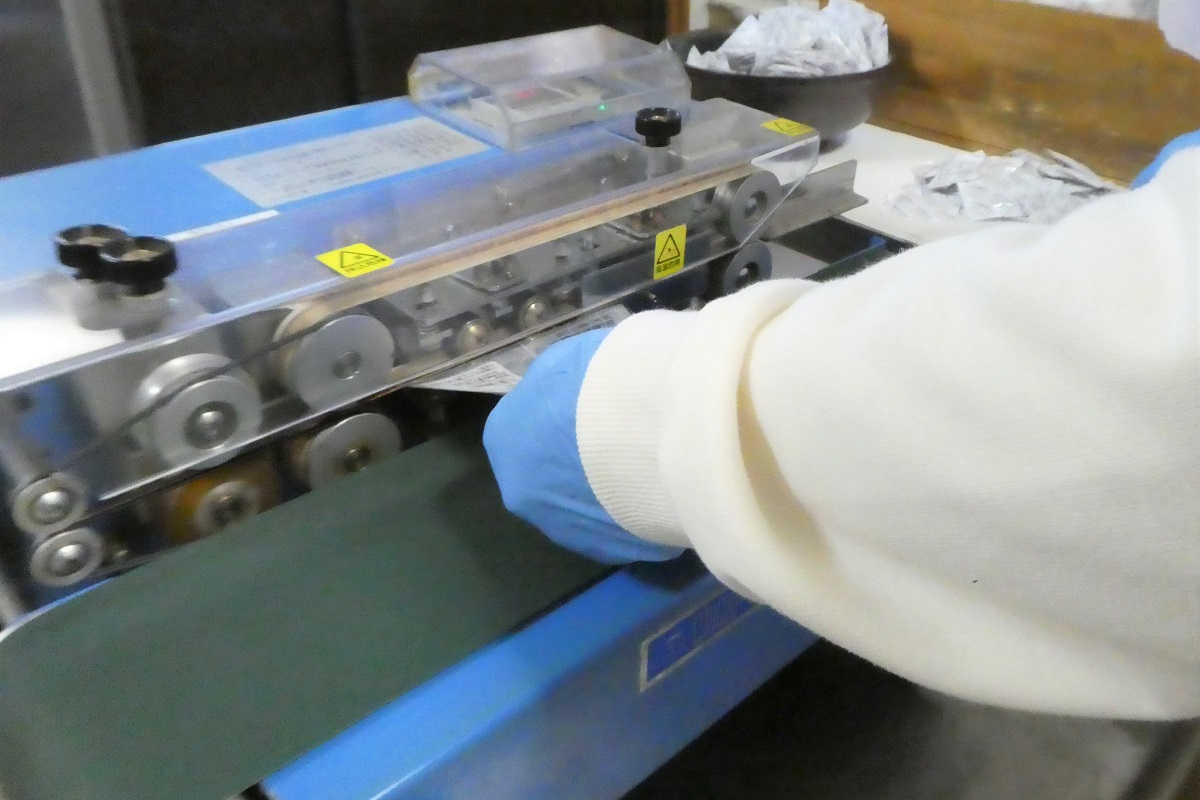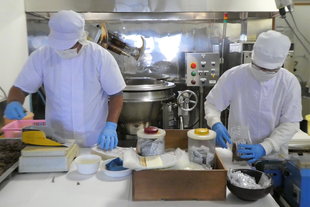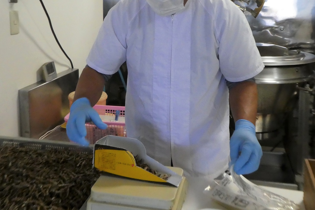 「きびなごケンピ」は計量、袋詰めも人の手で行われる。八重丸水産の社長である中野利行さんと陽美さん夫妻の息が合った手さばきで、次々と「きびなごケンピ」を袋に詰めていく。