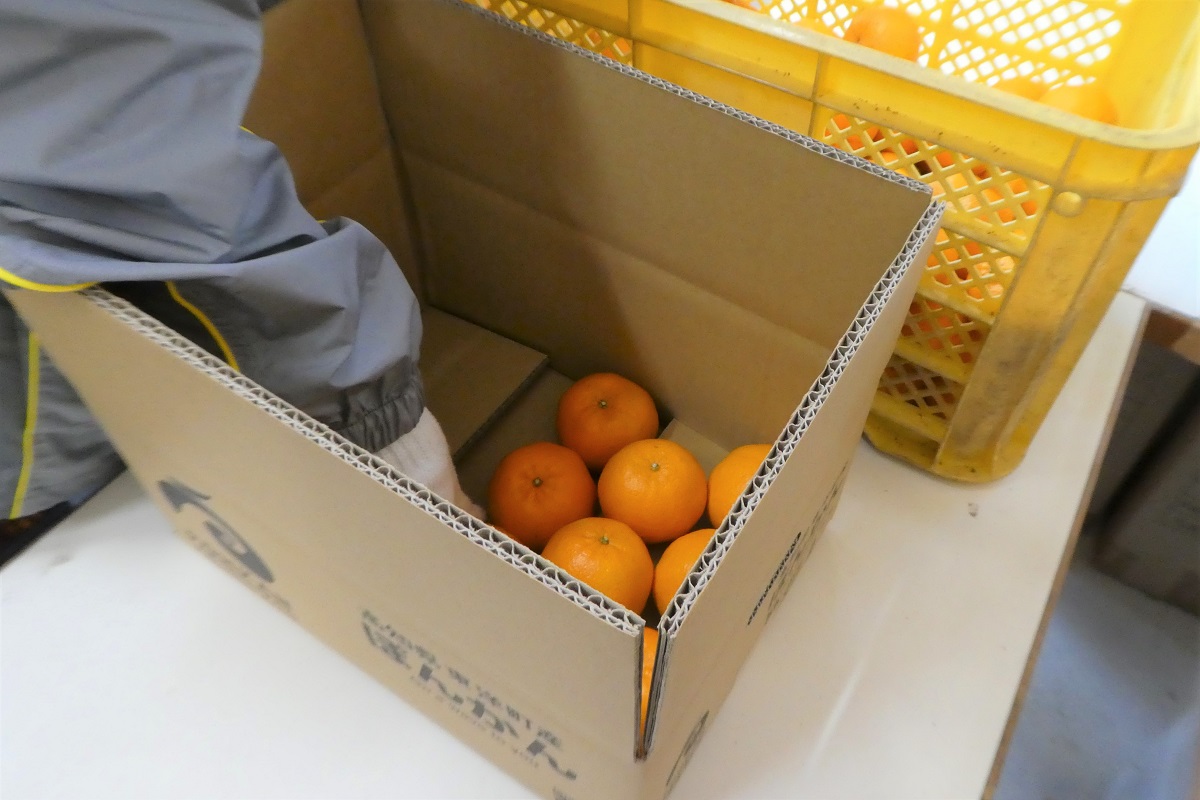 収穫した直後のぽんかんは酸味が強いためすぐに出荷できるわけではなく、ぽんかんらしい優しい味わいと鮮やかな香りが出るまで追熟したのち、傷などがないかを確認して箱にやさしく丁寧に詰めてから出荷する。