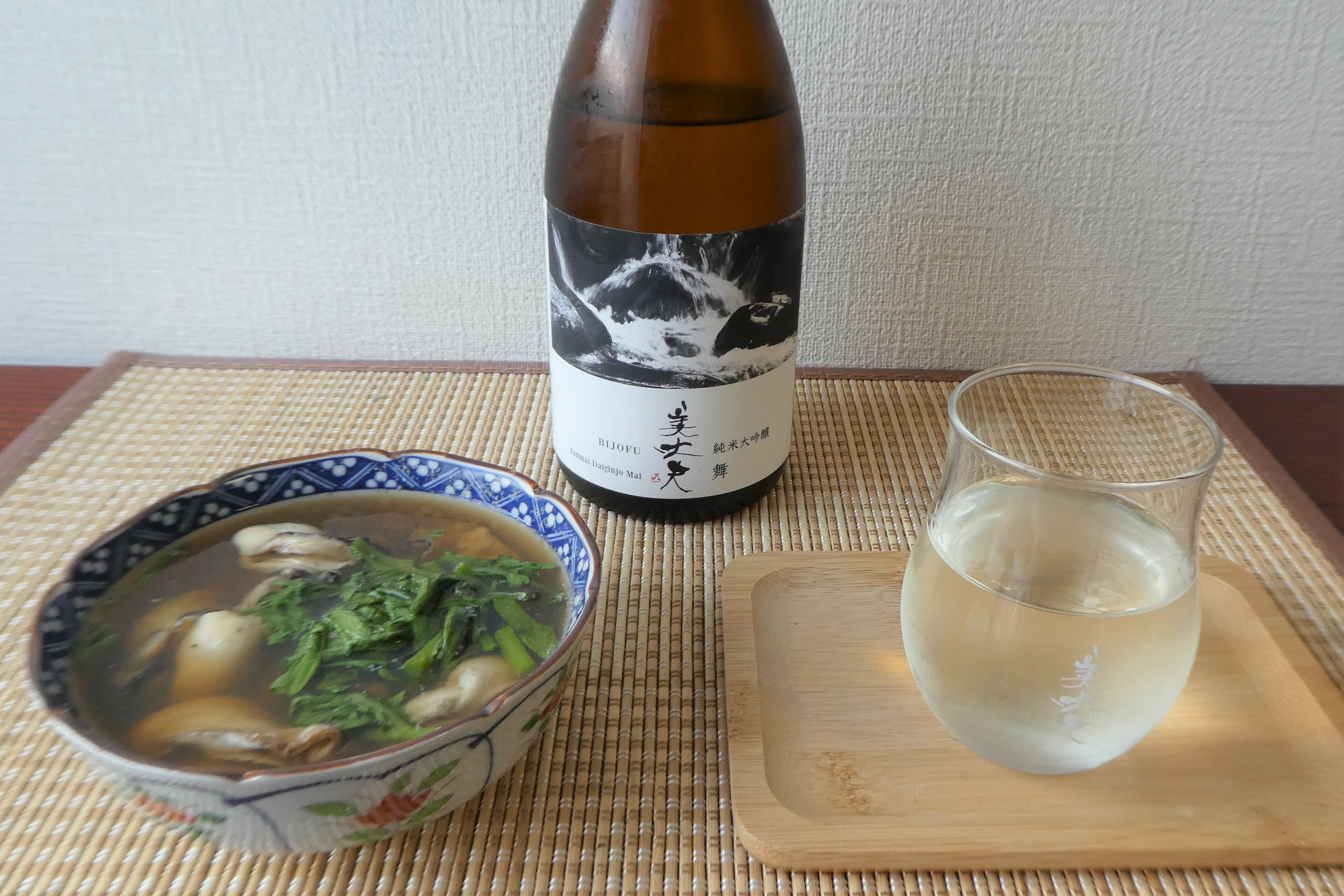 まずは和食、「焼き油揚げとネギのポン酢がけ」と「牡蠣のさっと煮」で「純米大吟醸 美丈夫 舞」をいただいてみる。