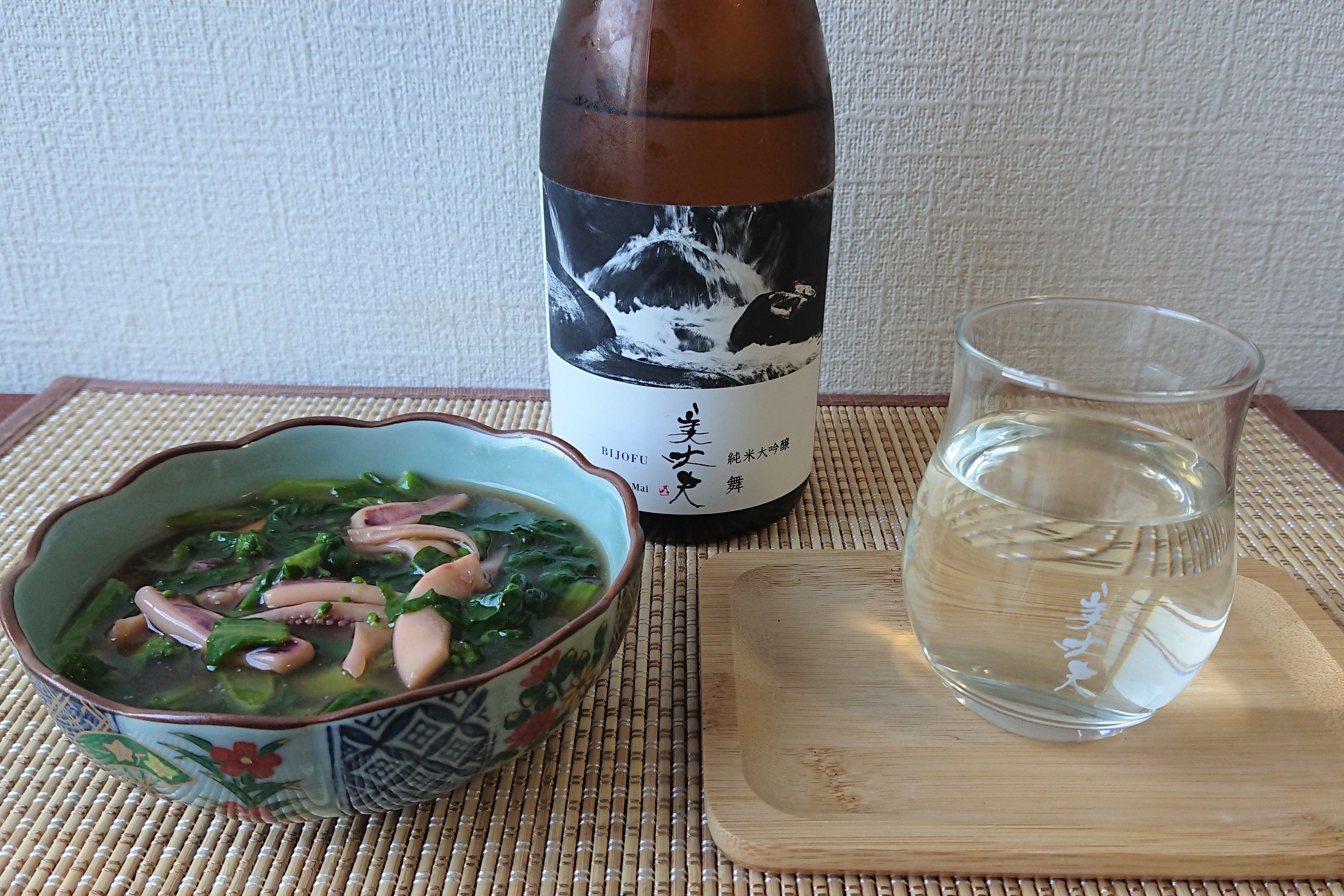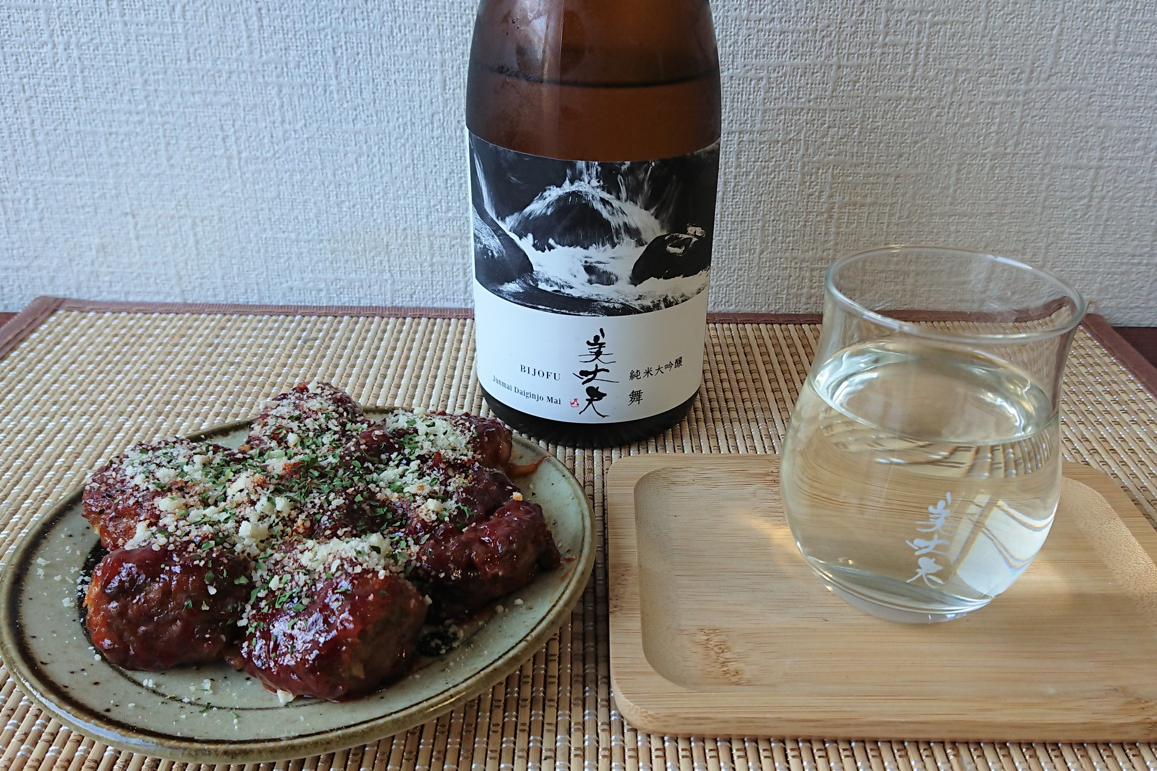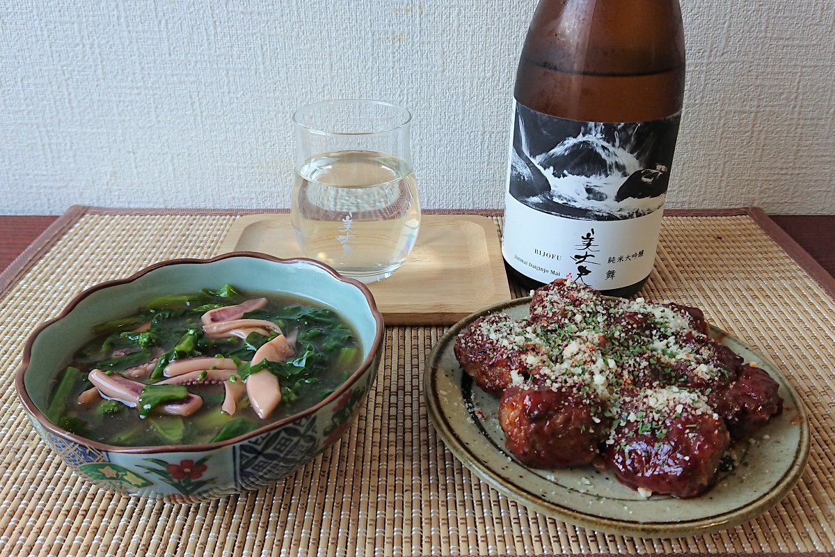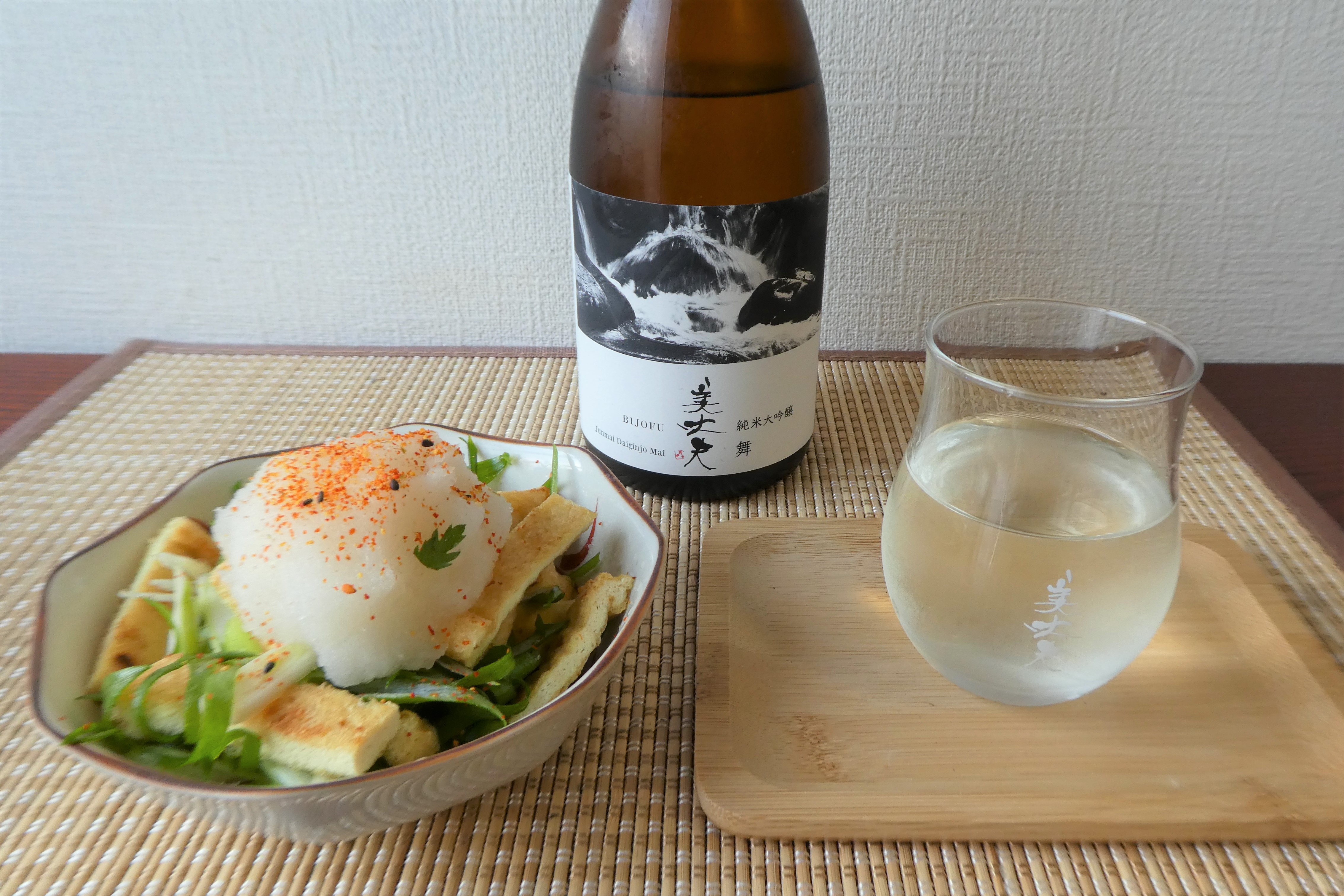 フライパンで上質の油揚げをこんがりと焼き、細く切ったネギと新鮮な大根おろしを合わせてポン酢をかければ出来上がる、「焼き油揚げとネギのポン酢掛け」は油揚げの香ばしさとポン酢のさっぱりした酸味を「美丈夫 舞」が優しく膨らませ、見事な一体感を表してくれる。やはり酢を使った料理と合わせる酒は日本酒が一番であり、「美丈夫 舞」のほのかな甘みがよく合う。