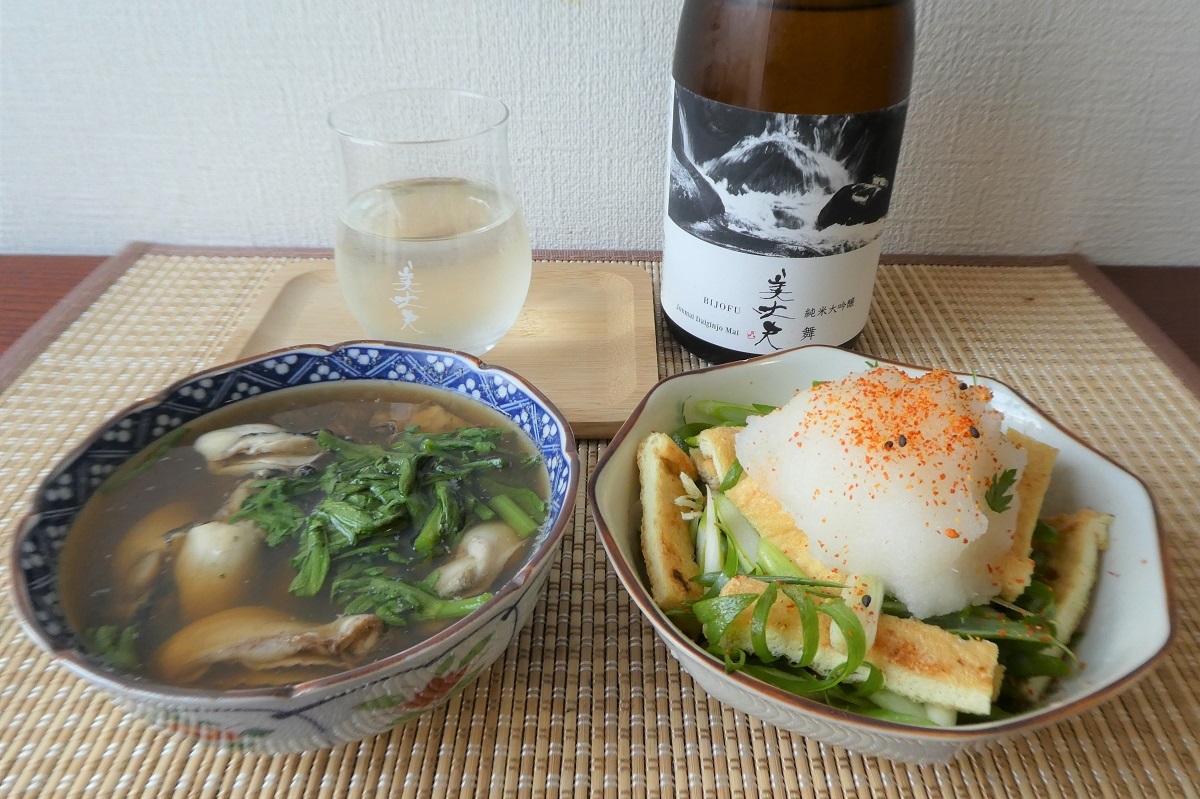 まずは和食、「焼き油揚げとネギのポン酢がけ」と「牡蠣のさっと煮」で「純米大吟醸 美丈夫 舞」をいただいてみる。