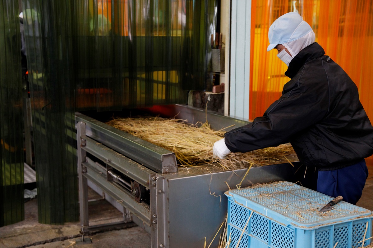 藁焼き加工機に通りやすいということから、根元で刈られた長く状態の良い藁が必要になる。