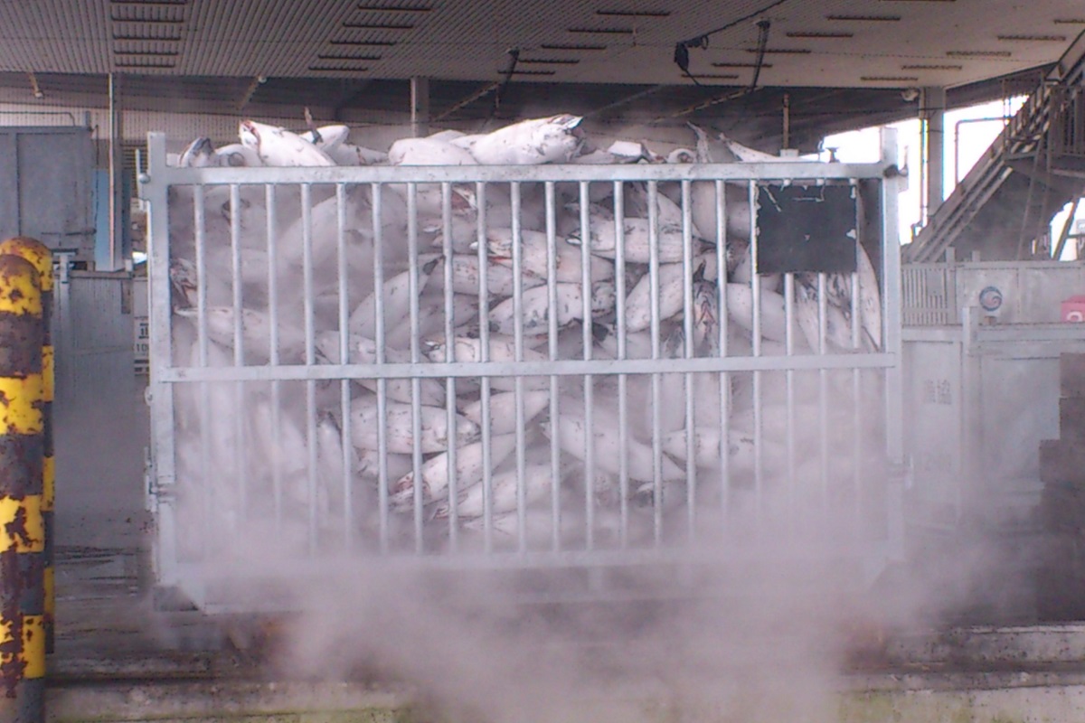 釣り上げられた鰹は、食塩ブライン凍結槽というマイナス20度の溶液の中に投入され、活きたまま急速凍結される。