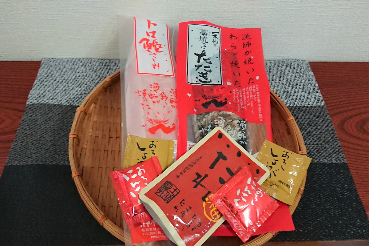 「明神水産」では「藁焼きたたき1節とトロ鰹さしみ1節セット」のほかにも鰹のたたきを中心に様々な商品を扱っている。