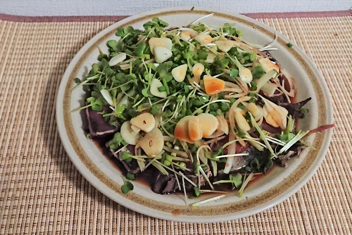 切った「藁焼きたたき」を皿に盛り、たっぷりの薬味をのせ、たたきのタレをかけてやると完成だ。