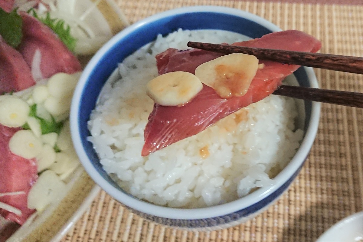 「トロ鰹さしみ」をニンニクとともにガブリとやり、ホカホカの白飯をいただけば、その相性の良さは抜群で実に美味い。