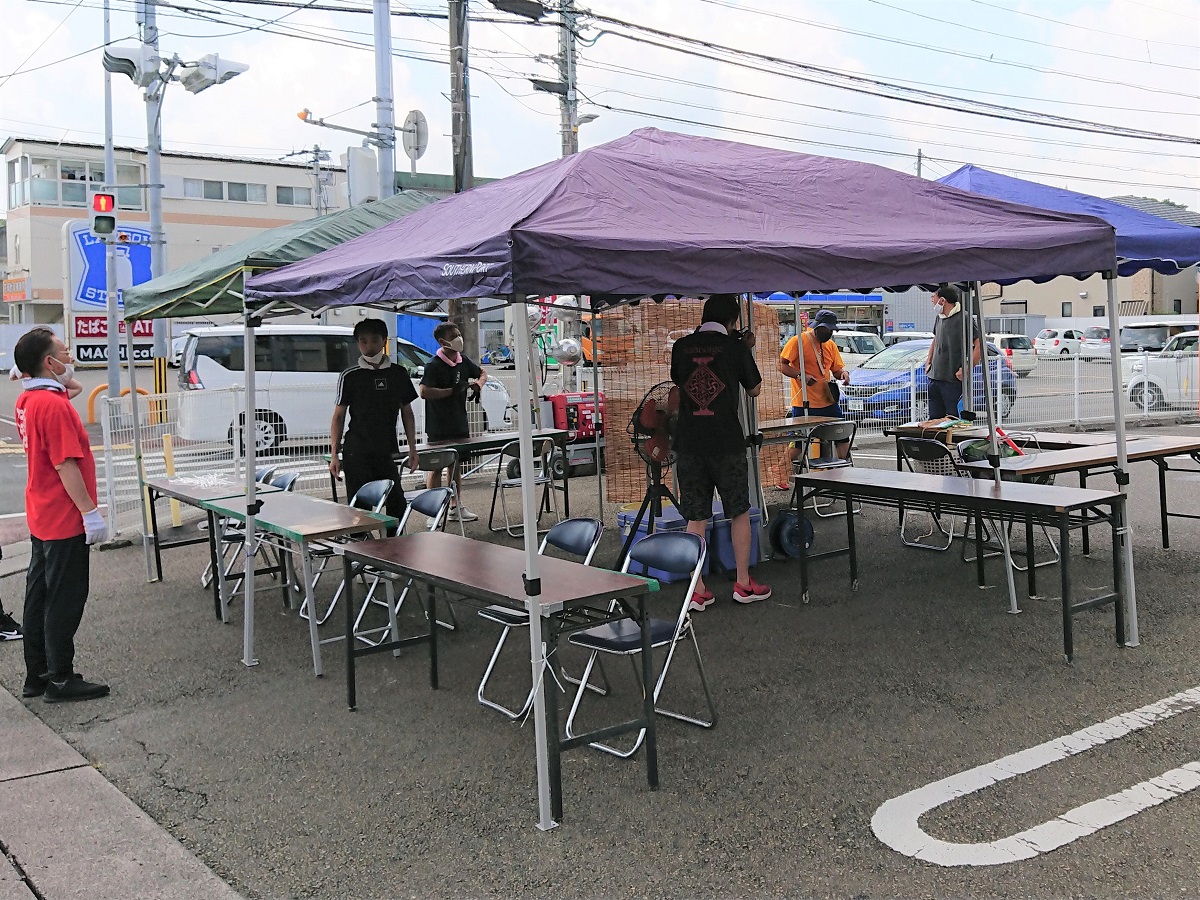 よさこいチームの受付や踊りのスタートの合図、地方車やバスの誘導・整理を行うスタッフが集まる受付席と、踊り終わった踊り子さんに給水で麦茶を渡すための接待所にもテントを立て、それぞれに机と椅子を配り、必要な備品を配布する。