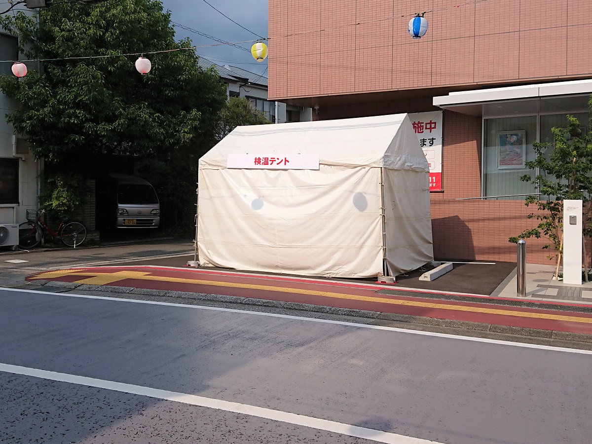 万々競演場では5カ所の検温テントを設置し、検温と手指消毒ができるようになっている。