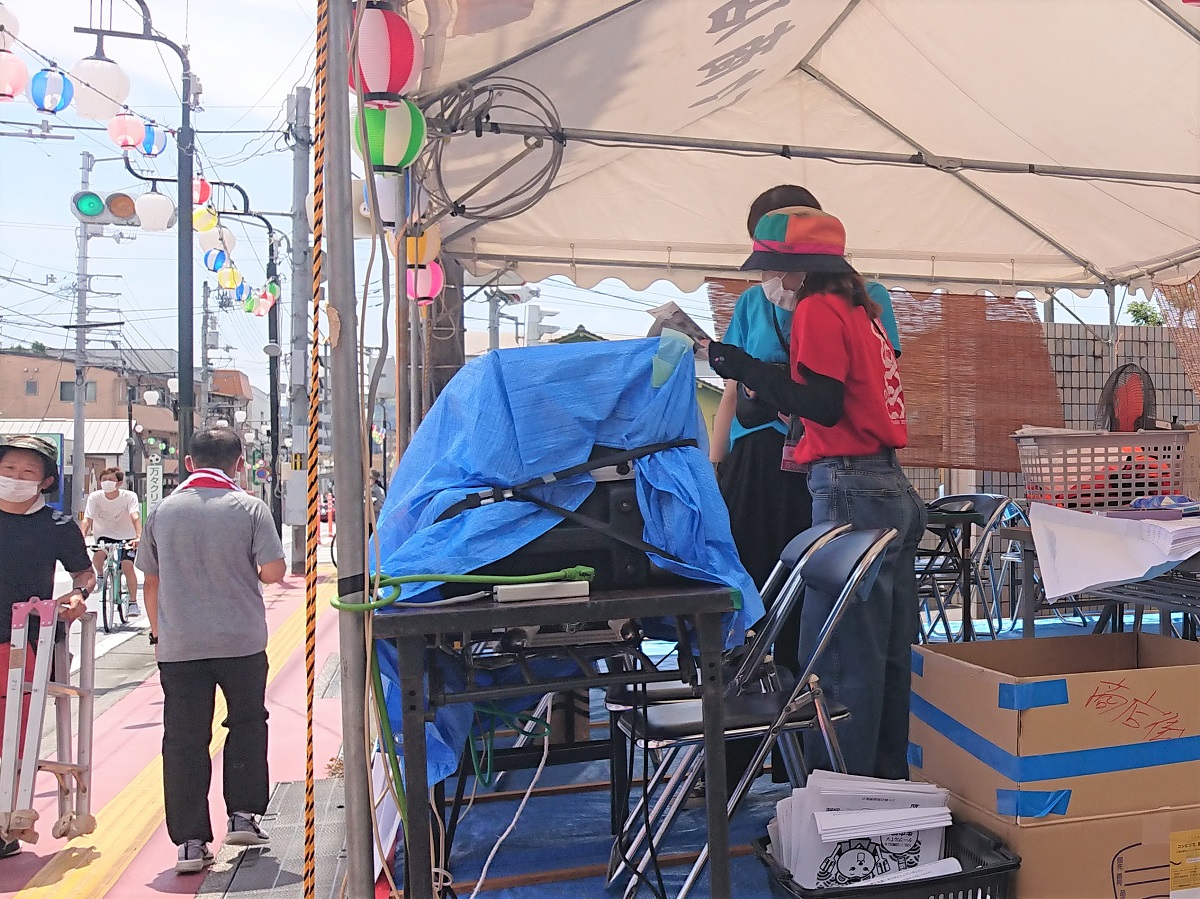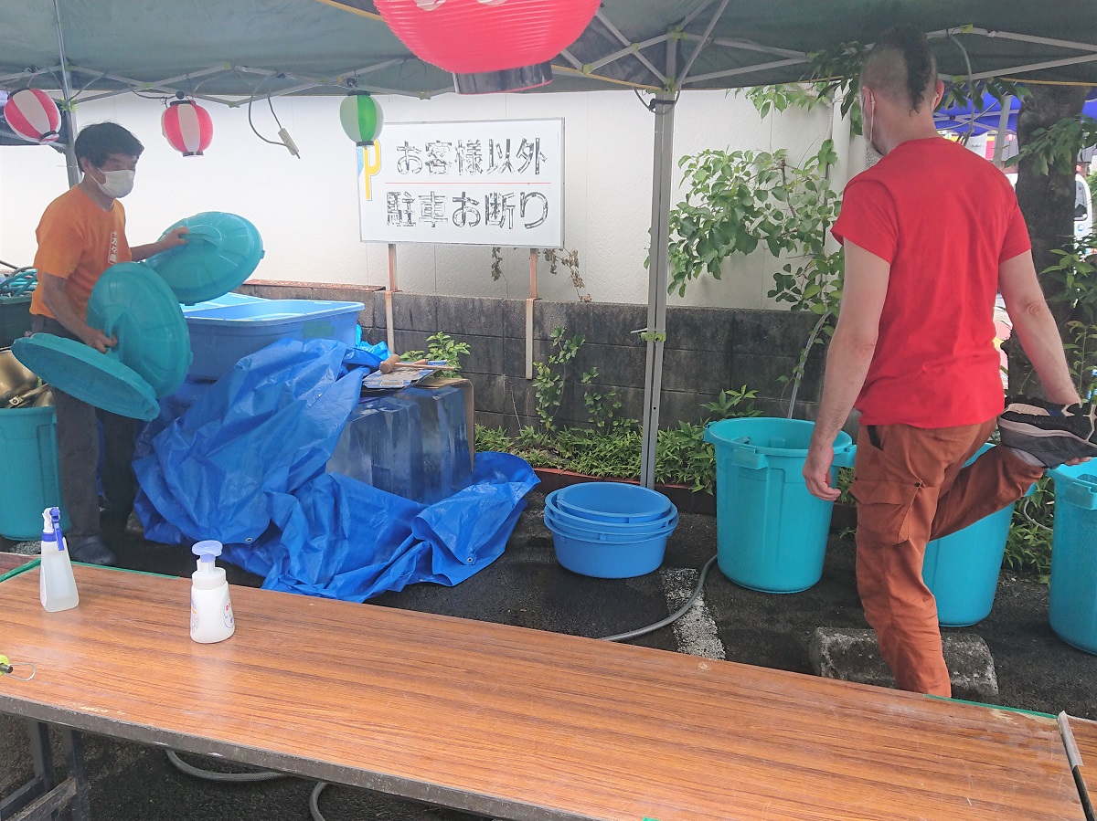 本部席では、アナウンスや道路警備の最終確認が行われ、接待所では踊り子さんに振る舞う麦茶と氷の準備に取り掛かる。
