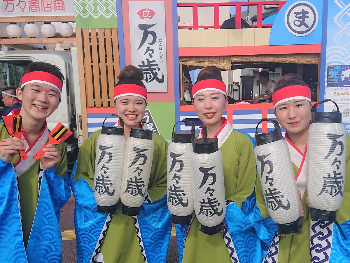 隊列を整えた万々商店街振興組合のよさこいチーム「万々商店街 万々歳(ばんばんざい)」の踊り子さん60名が、地方車からの掛け声とともに踊り始める。