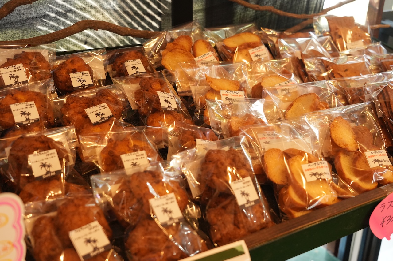 焼き菓子は、ナッツやフレークが入ったクッキー「けんちゃんのカリカリ(350円)」や、甘すぎず香ばしく仕上げた「こめこぽりぽり~やめられない~(300円)」などユニークなネーミングの商品が並ぶ。