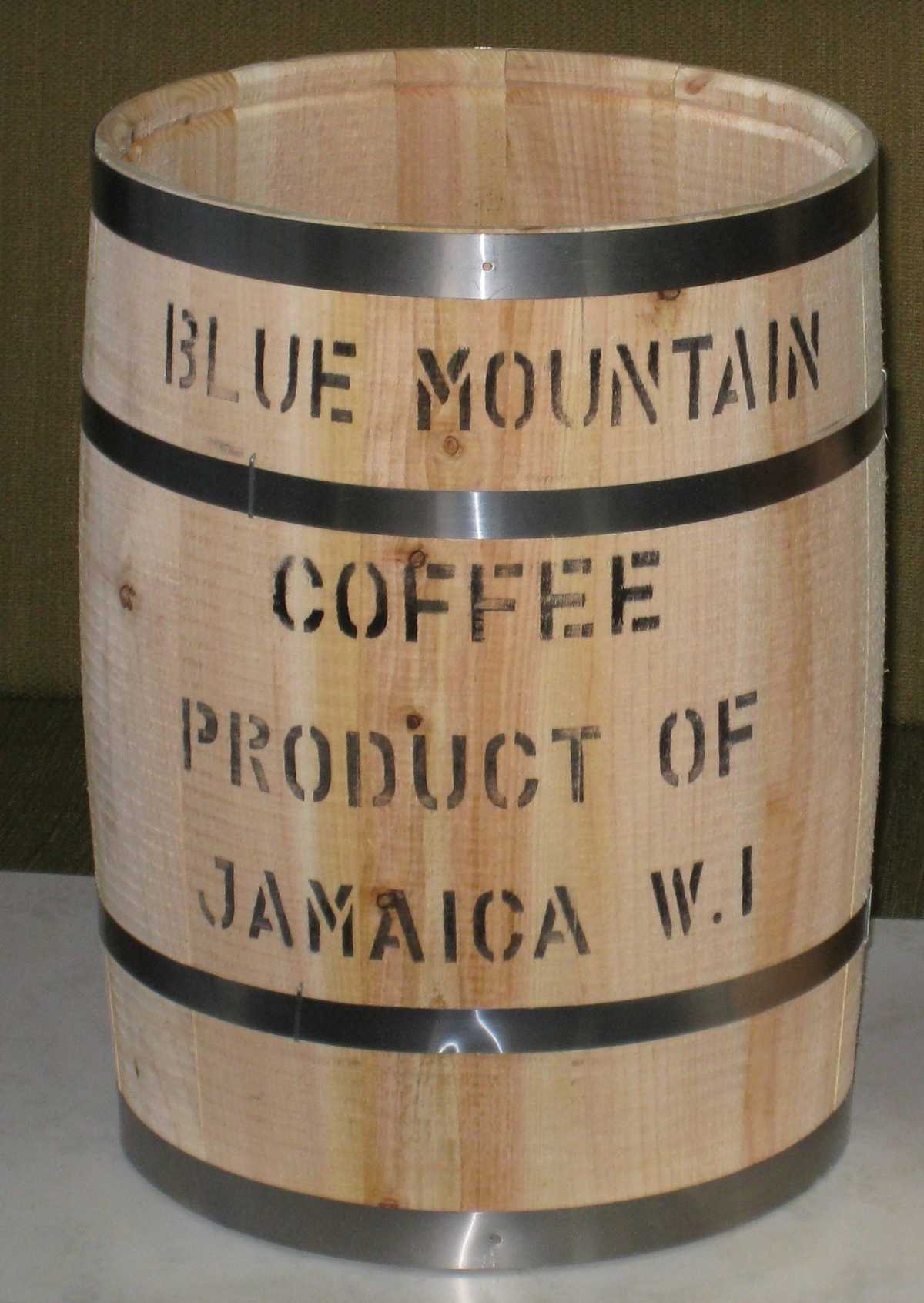 全面にヒノキ材が使用され、「BLUE MOUNTAIN」 とか「COFFEE」などの文字が施された樽である。