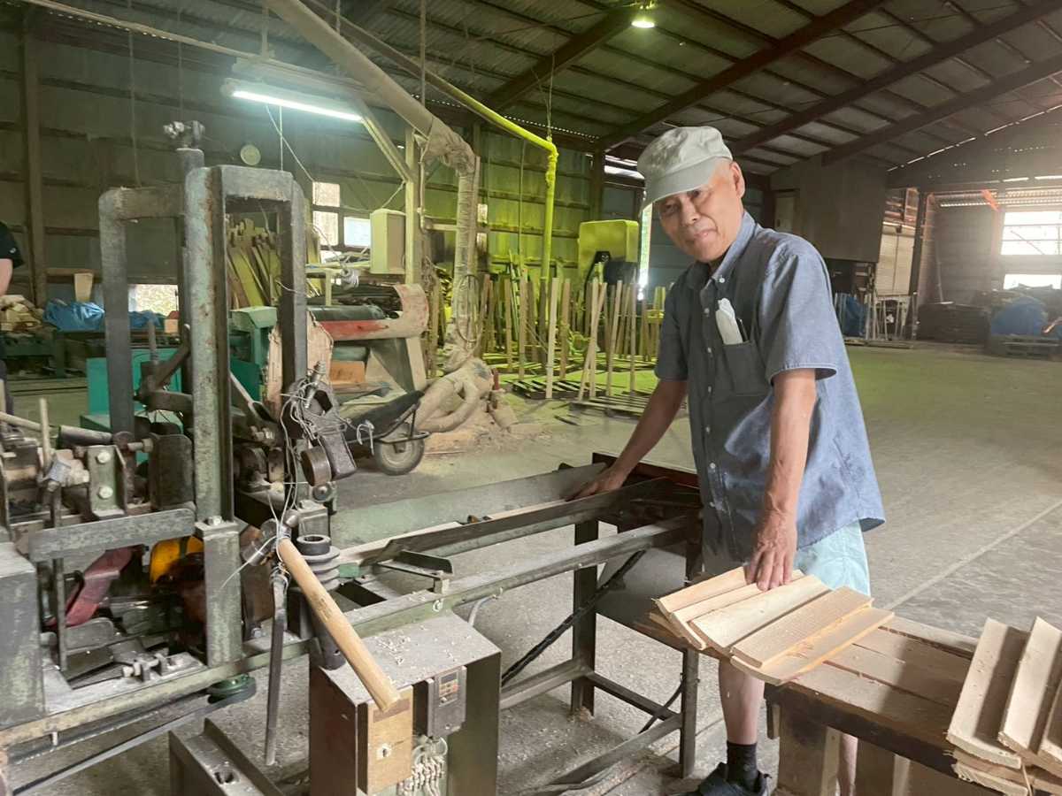 共栄木材の社長の父で前社長の味元和義さん(73)が胸を張る。高級な建築材料として使用される四万十ヒノキ。