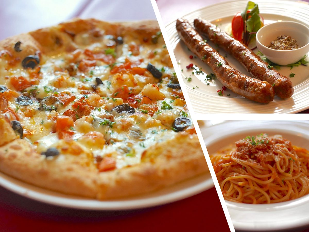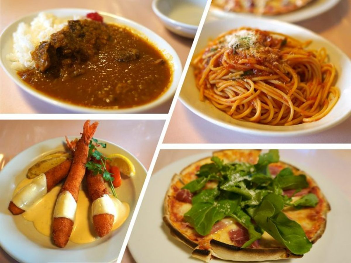 メニューには、ポタージュスープや人気のエビライスやチキンカツ、オムライスやカツカレーもあり、ピザはマルゲリータをはじめとして16種類もあります。