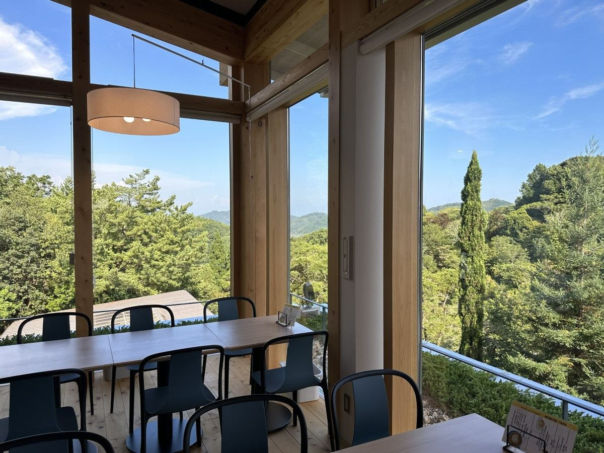 店内はどの客席もガラス窓に面していて、床から天井までの大きな窓から園内はもちろん、遠くの山々まで見渡すことができます。