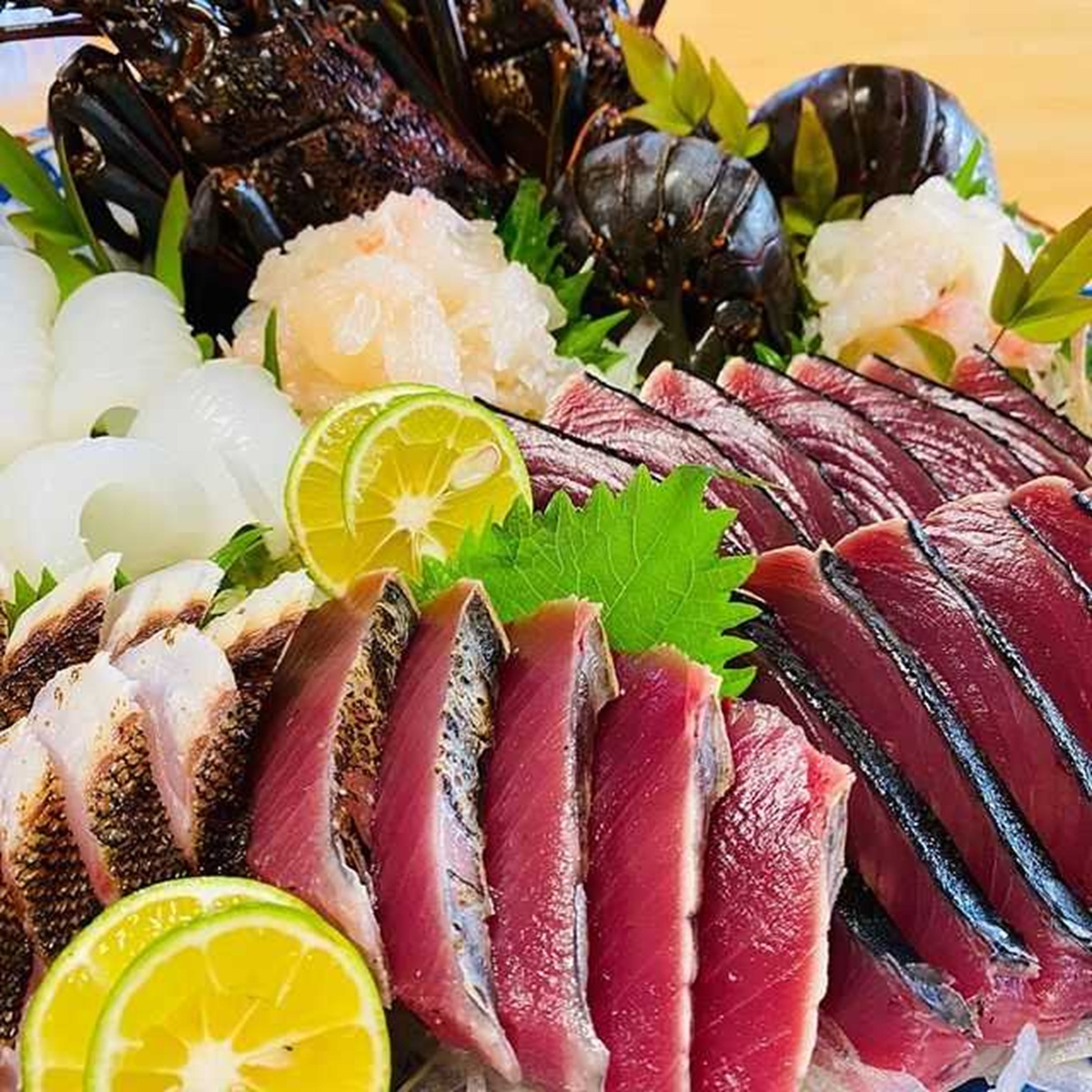 刺身の盛り合わせは、その日入荷したばかりの新鮮な魚。カツオのたたきはもちろん、グレやブリ、イカなどが日替わりで登場する。