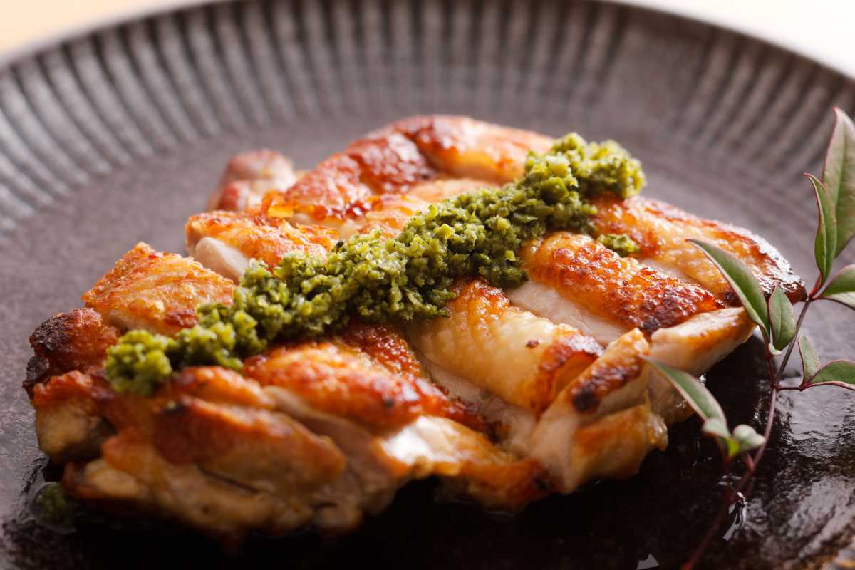 たたきには特製のタレ、添えるニンニクも自家菜園で栽培するこだわりようだ。