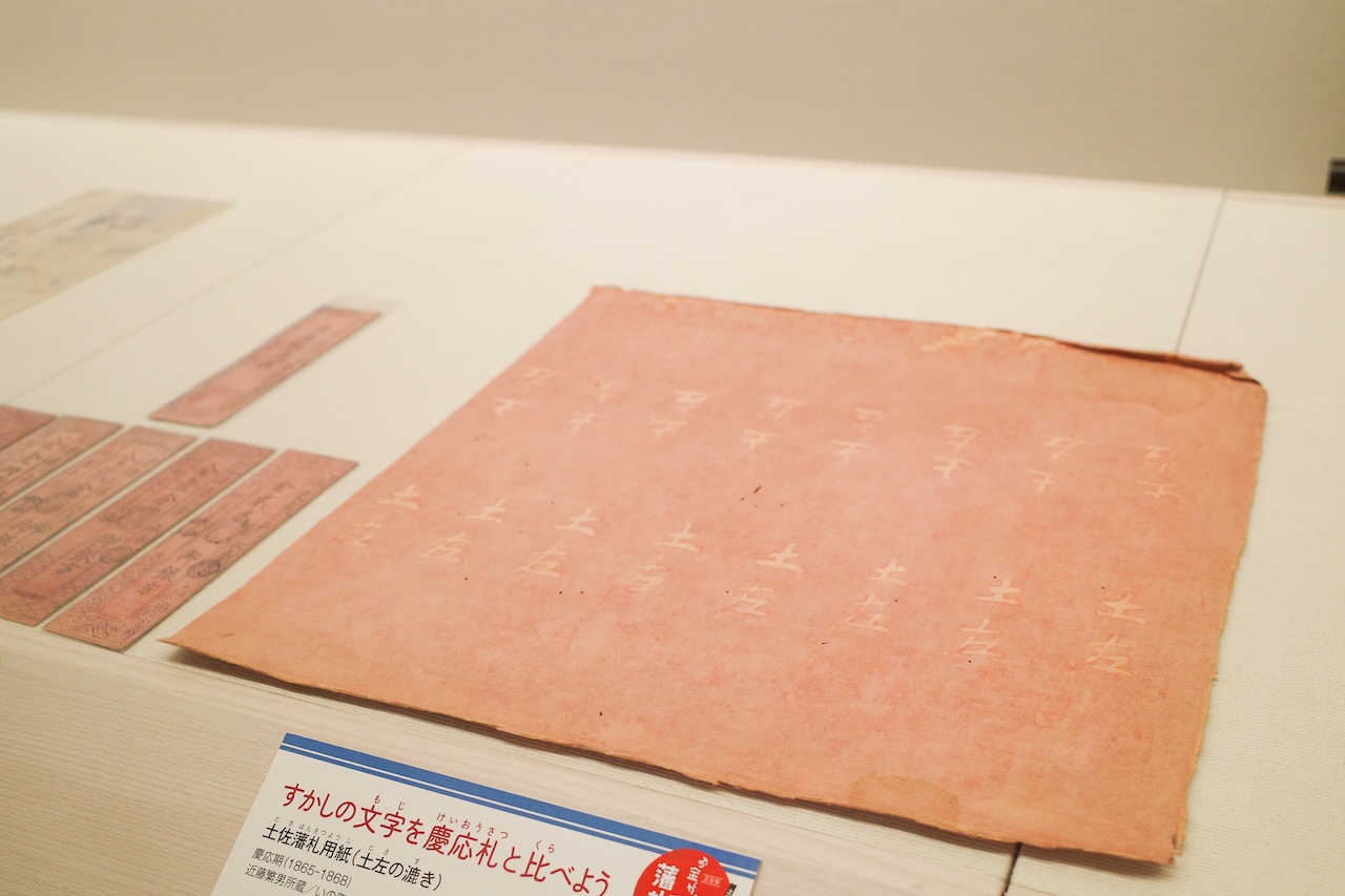 土佐藩の公用紙である桃色紙が使われていて、よーく見ると原紙には「土左」の透かしが施されている。