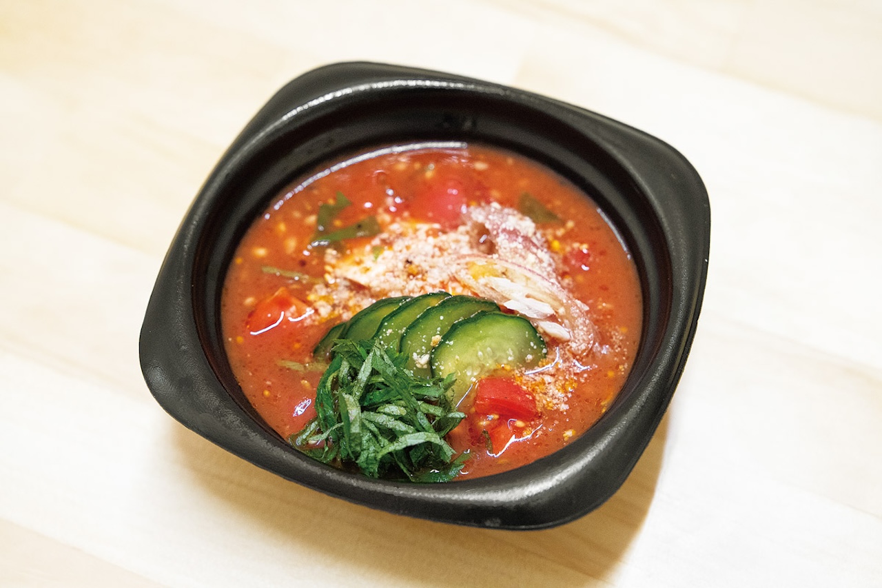 南インドの辛酸っぱいスープ"ラッサム"を、高知ならではのミョウガやシソなどの薬味でアレンジしたトマトスープだ。