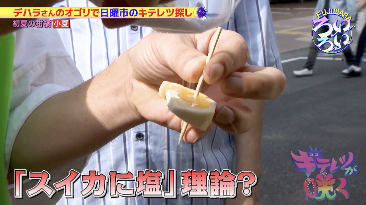 騙されたと思って、小夏に天日塩をかけるFUJIWARAの二人。
