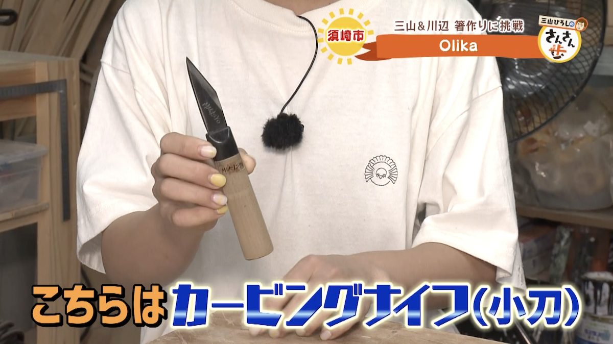 DIYが得意な三山さんは、台座を使ってカンナ削りするだけでは物足りないだろうという濵﨑さんの配慮(無茶振り)で、カービングナイフを使用して、お箸の削り出しに挑戦する。