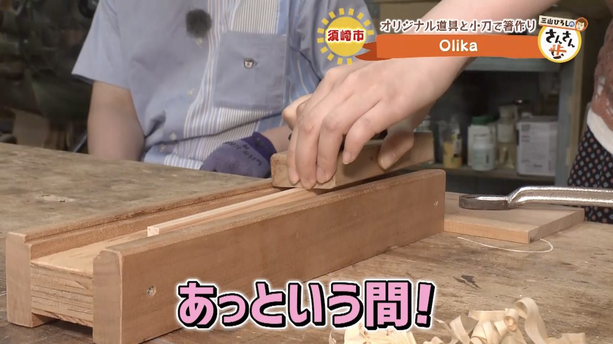 川辺アナは先ほどの台座を使用してカンナで削る。素人が使用すると、絶対にうまく削れないカンナだが、台座を使用すればあっという間にお箸の形に!