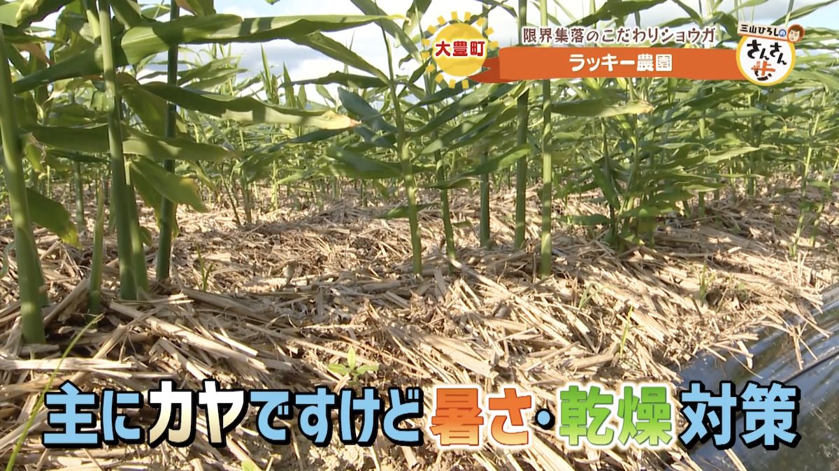 ちょうどこの日は、「土寄せ」と言われるショウガの株元に土を寄せて、カヤをかけて暑さや乾燥を防ぐ作業を行っていた。