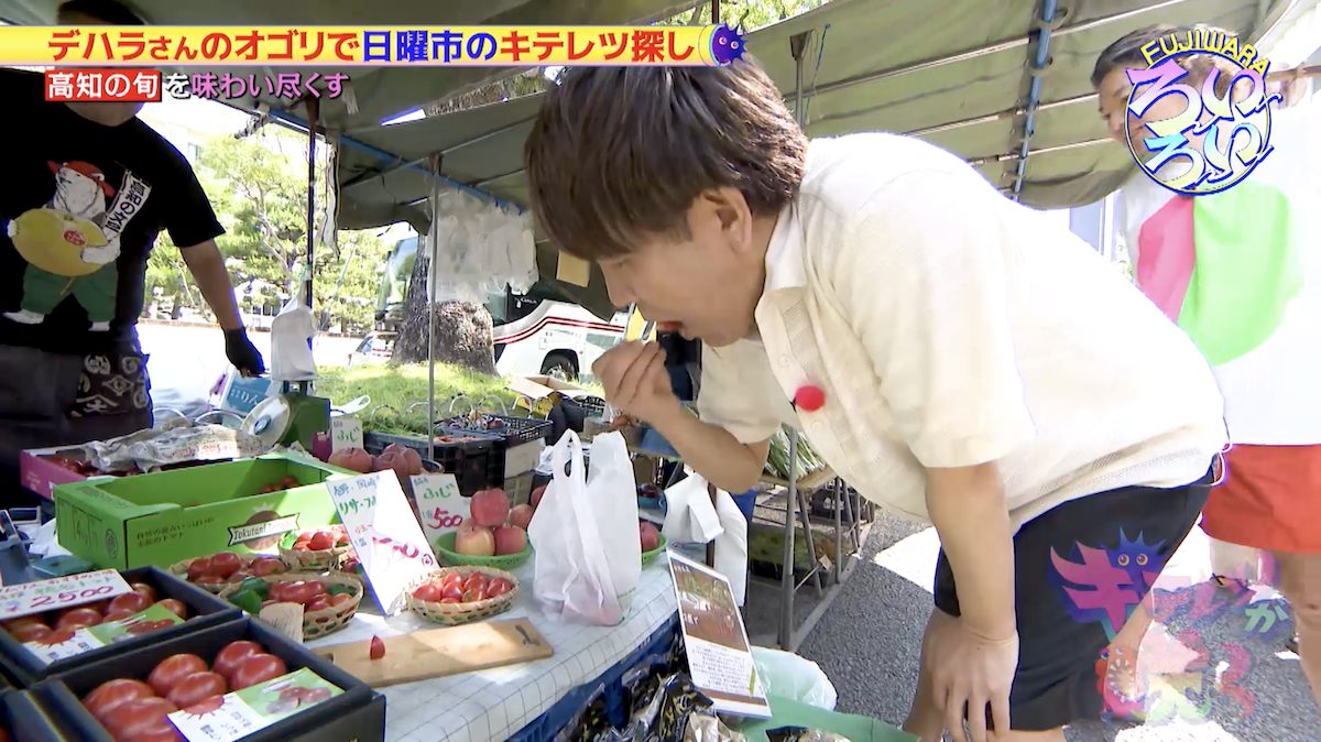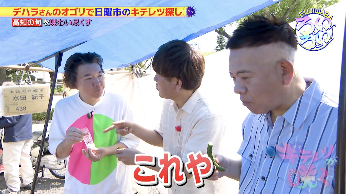 暗い話になりそうなので、機転を利かせたデハラさん。高知のきゅうりは味が濃いので食べて!とFUJIWARAの二人に勧める。