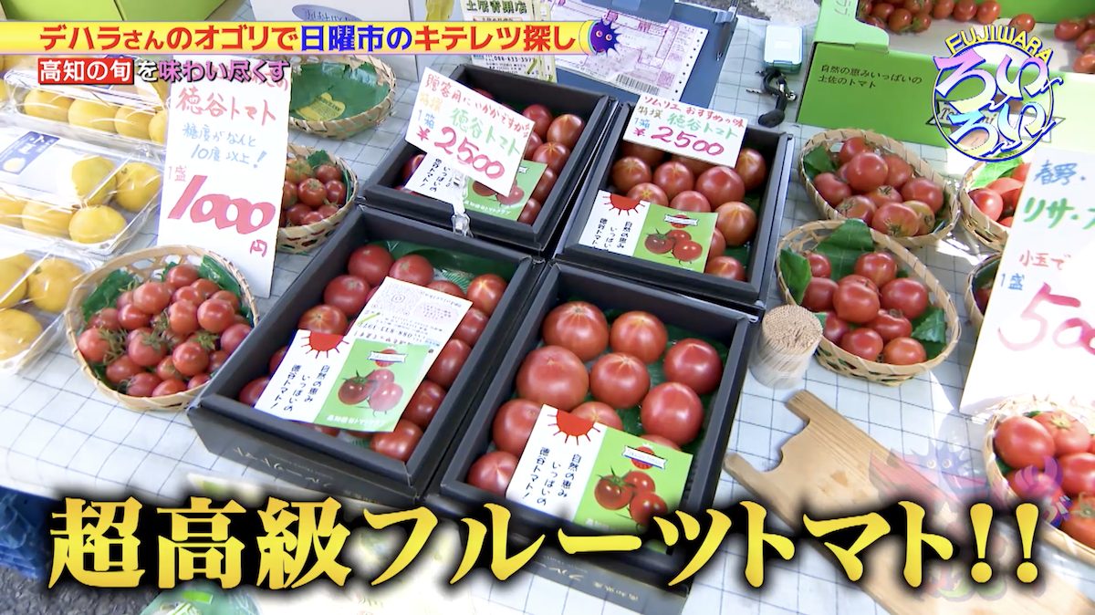 店頭には赤く輝く小ぶりなトマトがたくさん並んでいた!これは高知県の徳谷地区で栽培される「徳谷トマト」。