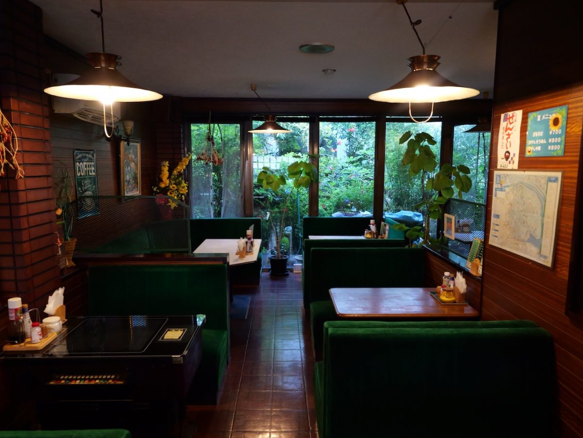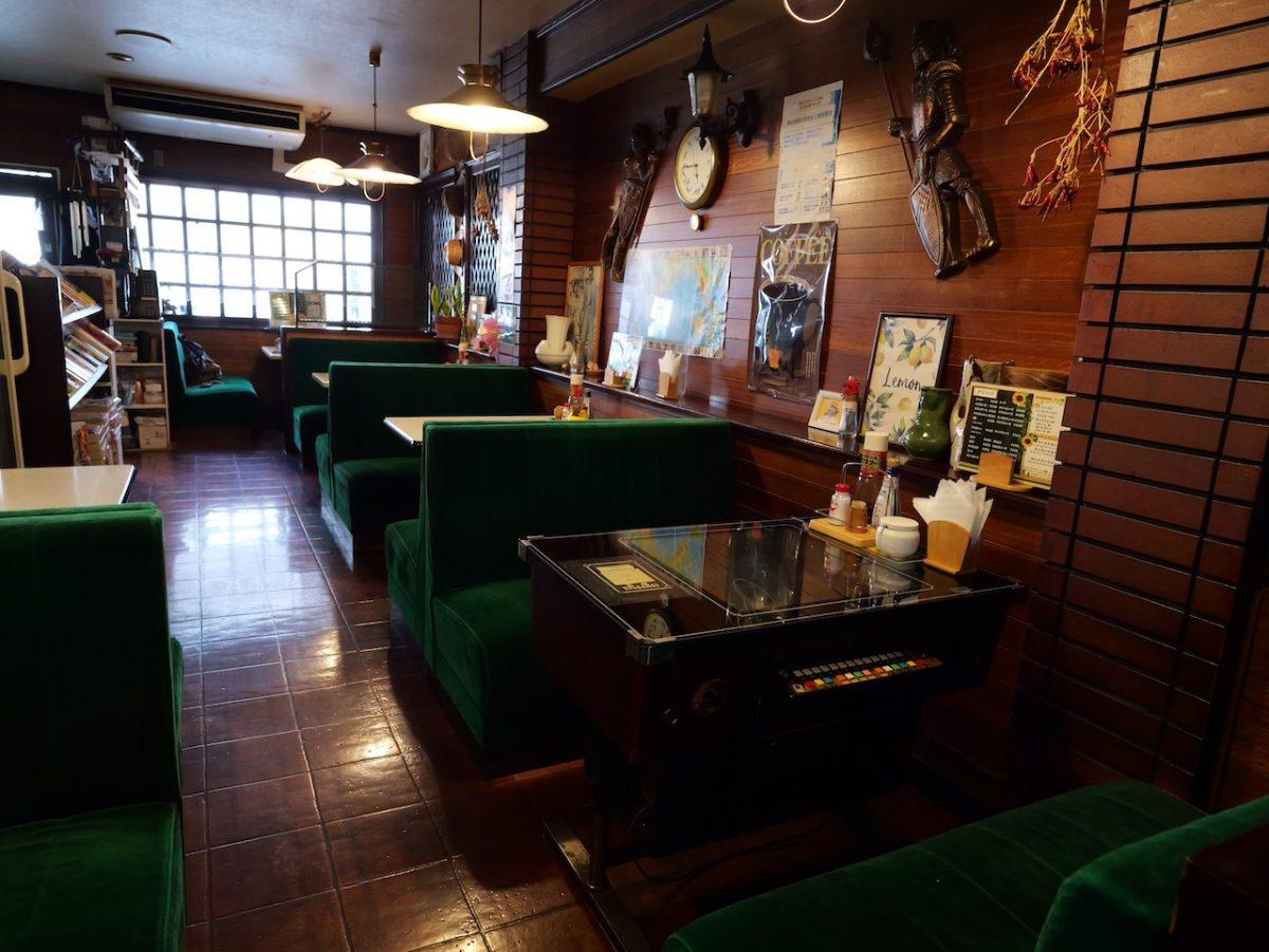 店内は緑色のベロア素材のソファに、麻雀ゲーム機のテーブルなど、これぞ昭和レトロ!と言わんばかりの懐かしい雰囲気。