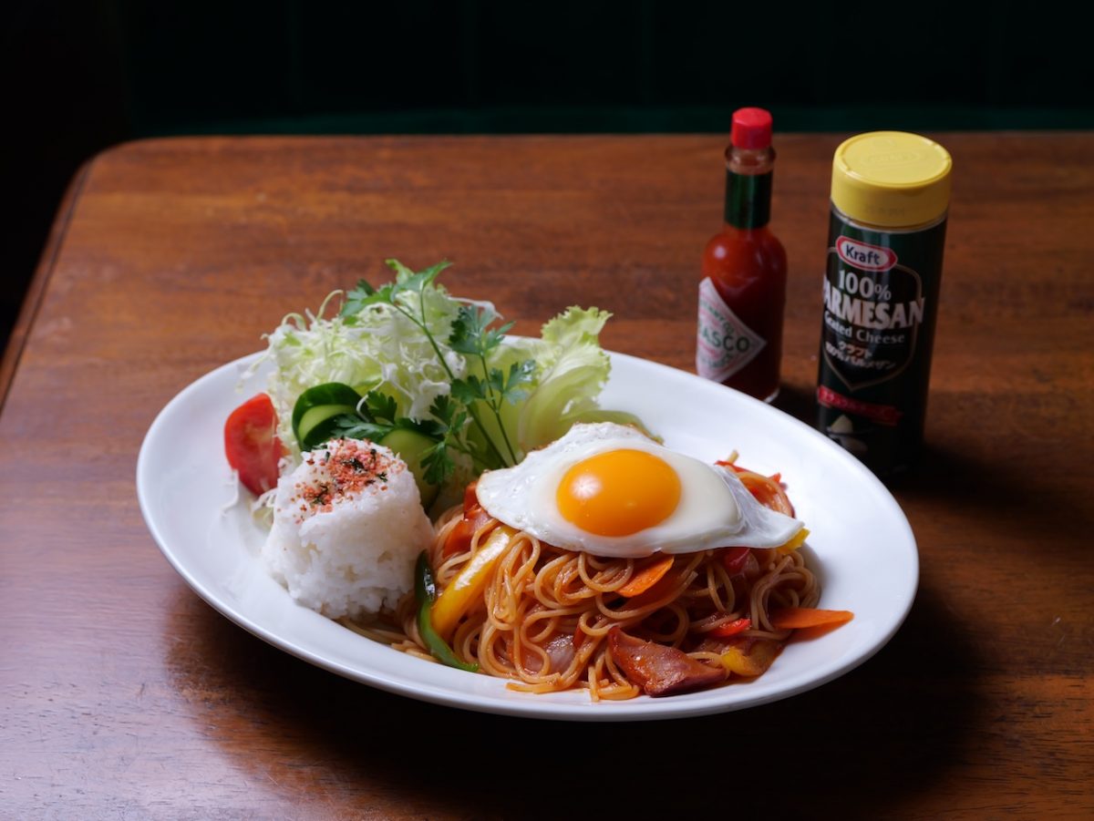 ナポリタンでは珍しい細めの麵を使用していて、玉ねぎやピーマン、豚肉などの具材がたっぷり入っている。またサラダや小盛りのご飯が添えられていて、ボリューミーな一皿。
