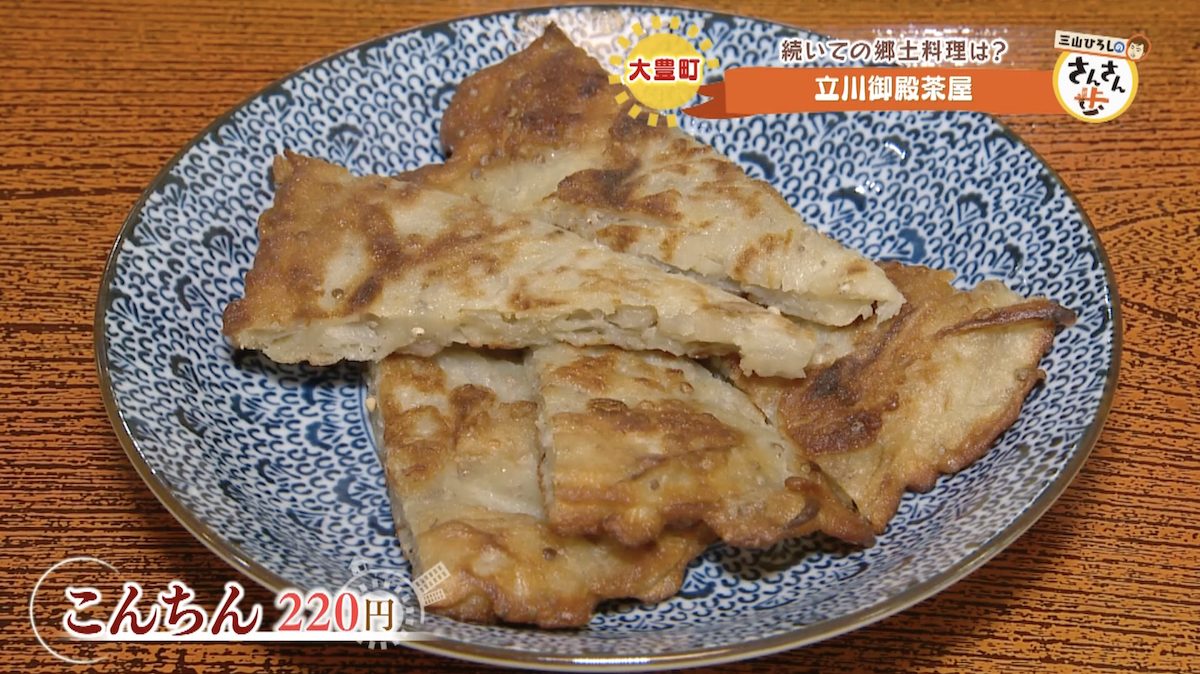 そばの他にも、ごぼうとエゴマを小麦粉に混ぜ合わせて焼いた「こんちん」と呼ばれる名物料理も提供している。