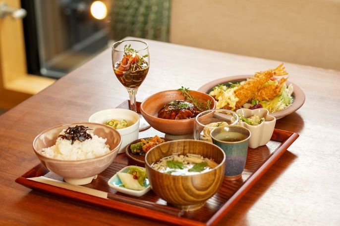 新鮮な高知野菜を薬味やハーブでアレンジした、酢の物、和え物、揚げ物など様々なおばんざいに、メイン、トッピング付きのご飯、出汁の効いた三つ葉のお吸い物などがバランス良く並び、ランチ内容は日替わり。