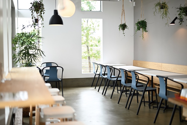 店内は大きな窓から優しい光が差し込む。シンプルで爽やかな都会的な建物に、柔らかな雰囲気の緑と優しい光が心地よい空間を演出する。