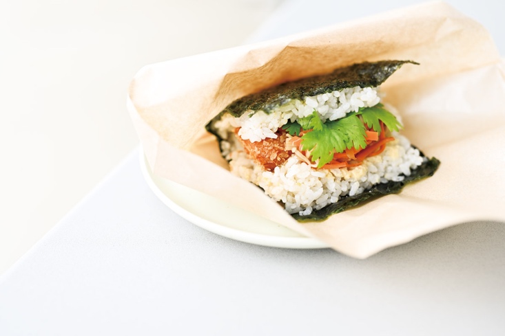 「GREEN GREEN CAFE」でいただけるのは、おにぎりとサンドイッチのハイブリット「グリーンサンド」。ご飯をパンの代わりに使用し、その間にたっぷりの具材を挟み込んでいる。