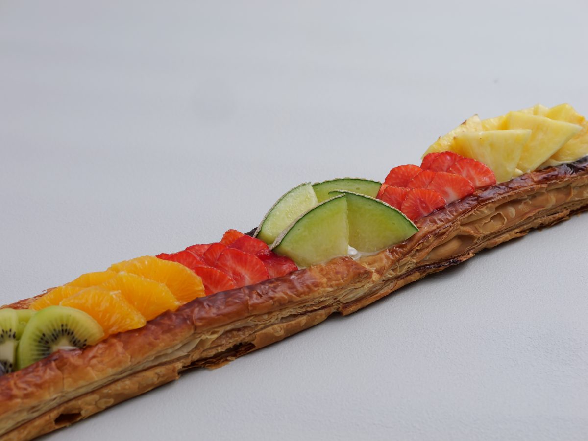 アーモンドを練り込んだ、全長47cmのパイ生地に、カスタードを敷き詰め、季節のフルーツをたっぷりとトッピング。(フルーツはおまかせ)