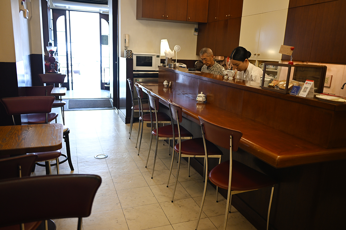 店内は、シンプルで落ち着いた雰囲気。平日の14時以降になるとカウンター前の席は常連客で賑わうことも。奥には4人掛けのテーブル席がある。