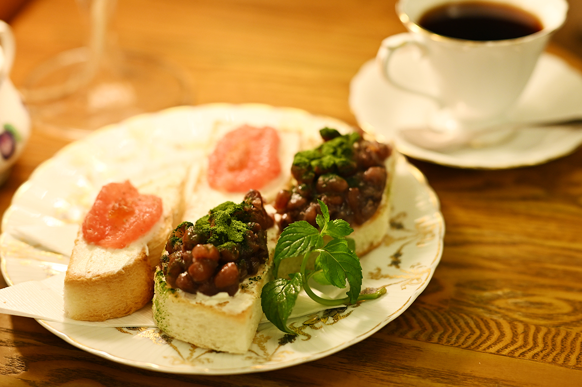 「あんぱんトースト」は、程よい甘さの自家製餡と、パンに塗られたマスカルポーネチーズのまろやかさが絶妙にマッチした上品な味わい。あんの上にかかった抹茶のほろ苦さがアクセントになっている。